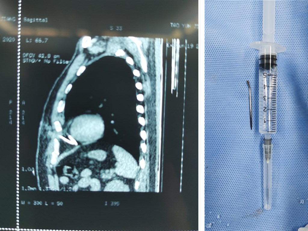 6月19日,一名大汗淋漓的患者来我院急诊科就诊,接诊时,患者左侧胸部剧烈疼痛,伴有呼吸困难,接诊医生详细询问病情及查体,了解到该患者于1天前不慎将一枚长约5cm的粗针自左侧前胸壁完全刺入胸腔内,进行相关检查提示左侧胸腔内金属异物,异物位于心包腔。患者病情危重,尖锐的金属异物随时可能刺破心脏及大血管,造成心脏破裂及大出血,导致死亡。