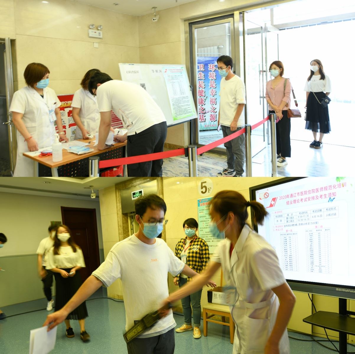 进入考场,等候区、扫码查验区、测温区、证件查验区、留观区五个功能区完善齐备。所有考生进考场前全部要上交国家电子健康码,扫描“行程码”验证大数据行程,同时上交考试前14天每天测量并记录的体温单,且必须体温正常,身体状态良好,签署考生考试承诺书,佩戴口罩后方可进入考场;禁止考生考试携带手机进入考场,进入试室时接受金属探测检查,并在试室内设置两台信号屏蔽仪,全程监控,以保证考试的公平公正。