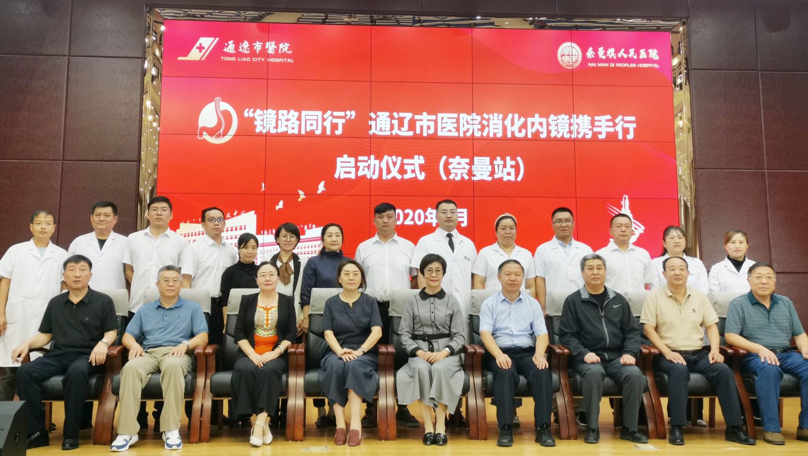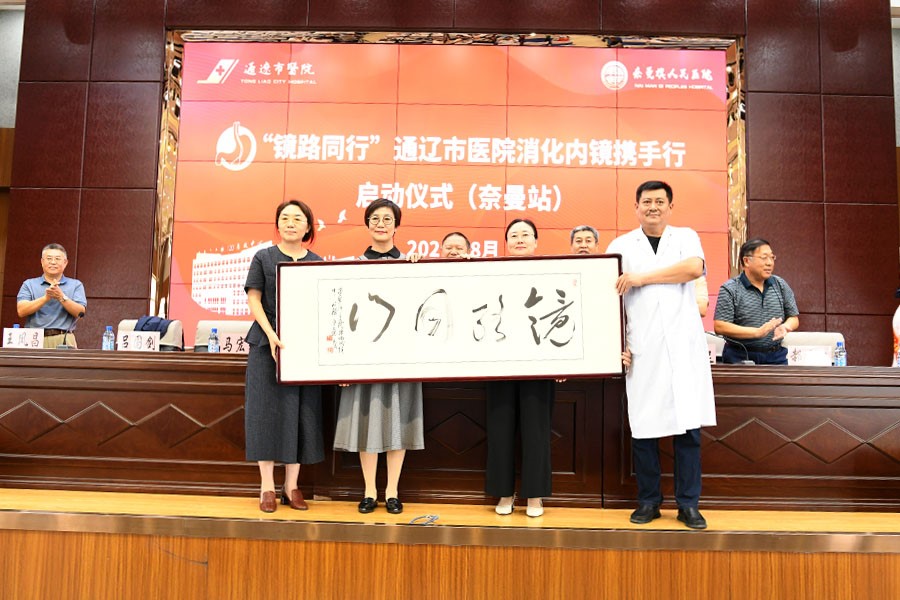启动仪式由奈曼旗人民医院王凤昌副院长主持,奈曼旗人民医院党委书记、院长杨立起致欢迎辞,奈曼旗人民政府副旗长邬君明出席启动仪式并讲话。我院杜艳秋副院长、消化内镜中心主任马宏珍分别在启动会上发言,并向奈曼旗人民医院赠送“镜路同行”牌匾。