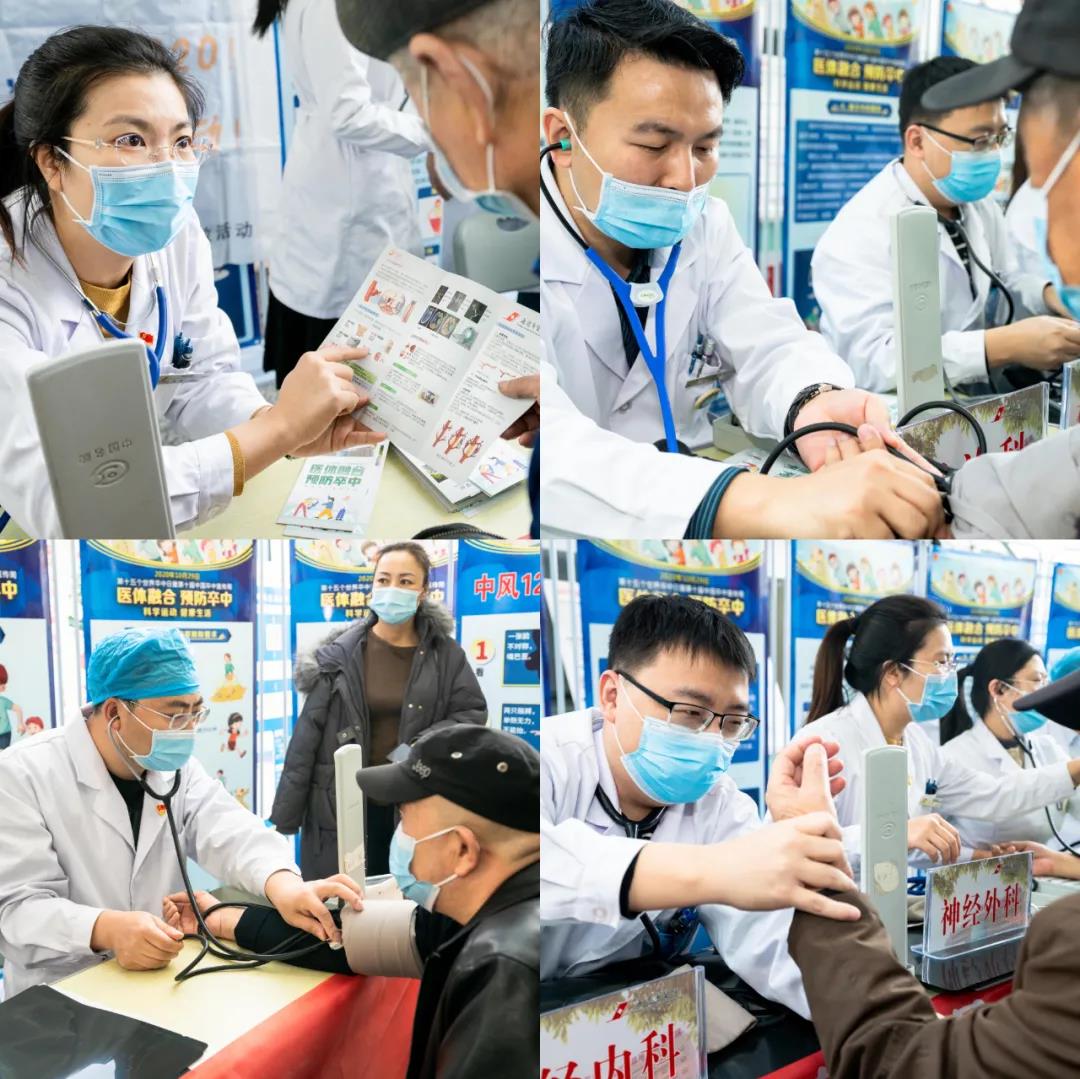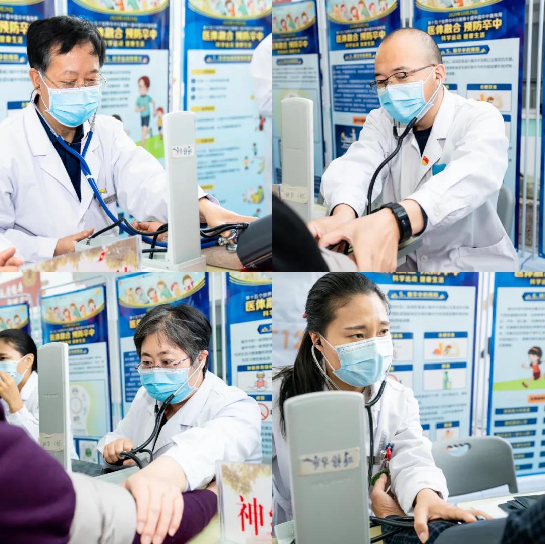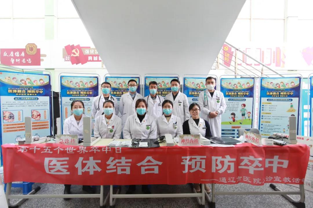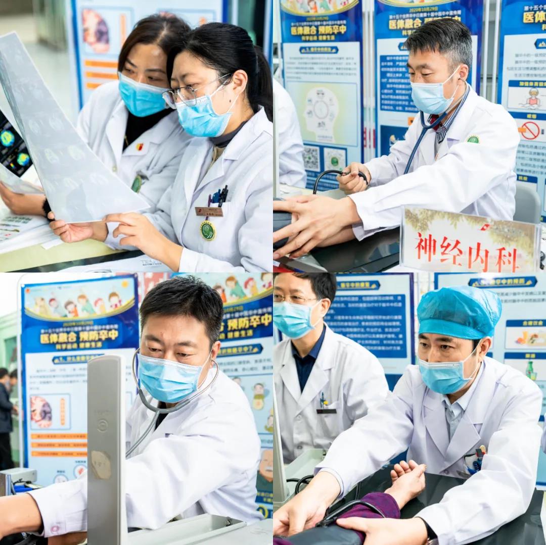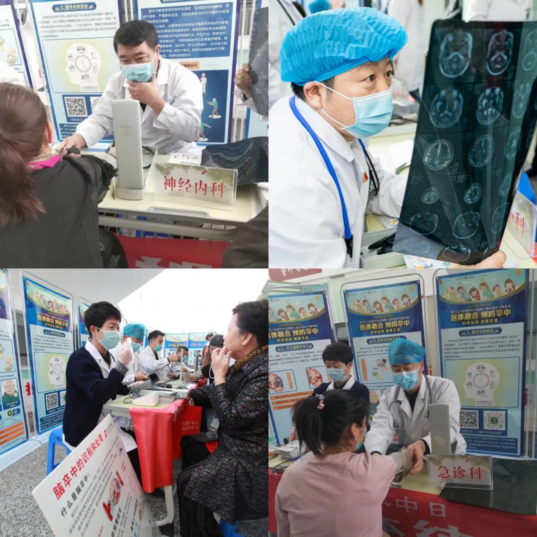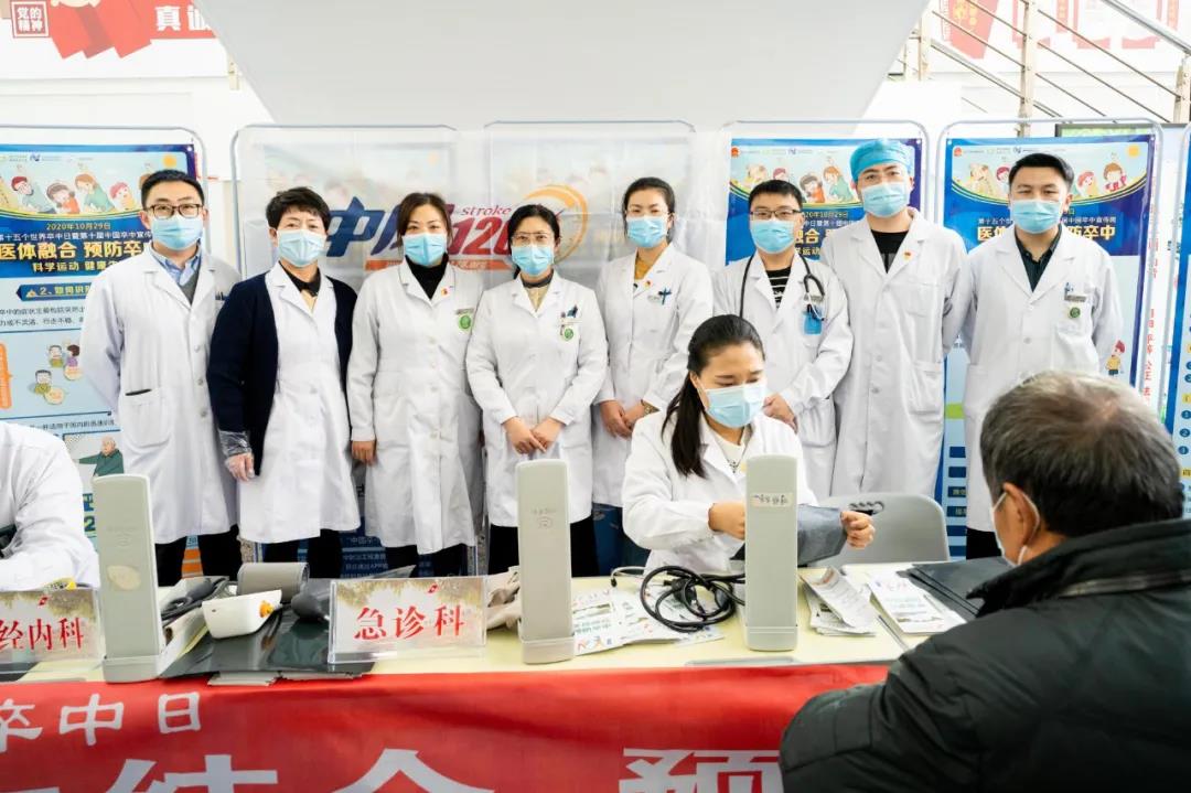 今年的10月29日是第15个世界卒中日,为提高居民脑卒中防治知识知晓率和控制率,倡导脑卒中的早防、早诊、早治,降低脑卒中发病率、复发率、致残率及死亡率,贯彻落实健康中国行动的重要举措,向广大人民群众宣传脑卒中防治知识,使人民群众了解科学运动对预防卒中的成效。在庆祝我院建院70周年之际,10月29日上午,我院卒中中心在门诊大厅开展了以“医体融合 预防卒中”为主题的宣教义诊活动。我院神经内、外科、急诊科权威专家共25人参加了此次活动。
