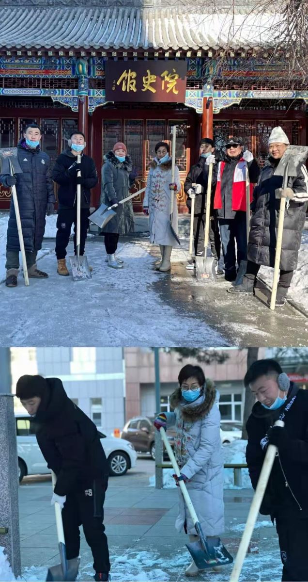 28日上午,志愿者们早早来到集合地点,总务科为大家拿来了清扫的工具,根据所到人数分8组进行清扫工作,分组完毕后各组组长带领大家马上投入到清扫积雪的工作中,大家冒着严寒,有人拿着破冰镐,有的拿着铁锹,有的拿着雪铲对院里的每个角落的积雪进行集中清扫,大家相互配合,团结一致。清扫刚刚开始不久有个熟悉的身影拿着铁锹加入到清扫阵营,大家一看原来是杜院长,都纷纷和杜院长说我们干就行了,而杜院长却说:“众人拾柴火焰高,大家一起干,这样能清扫的快点”。