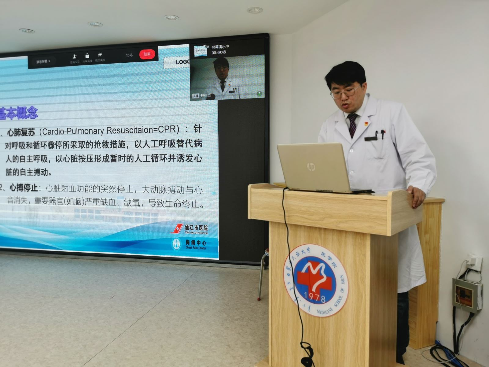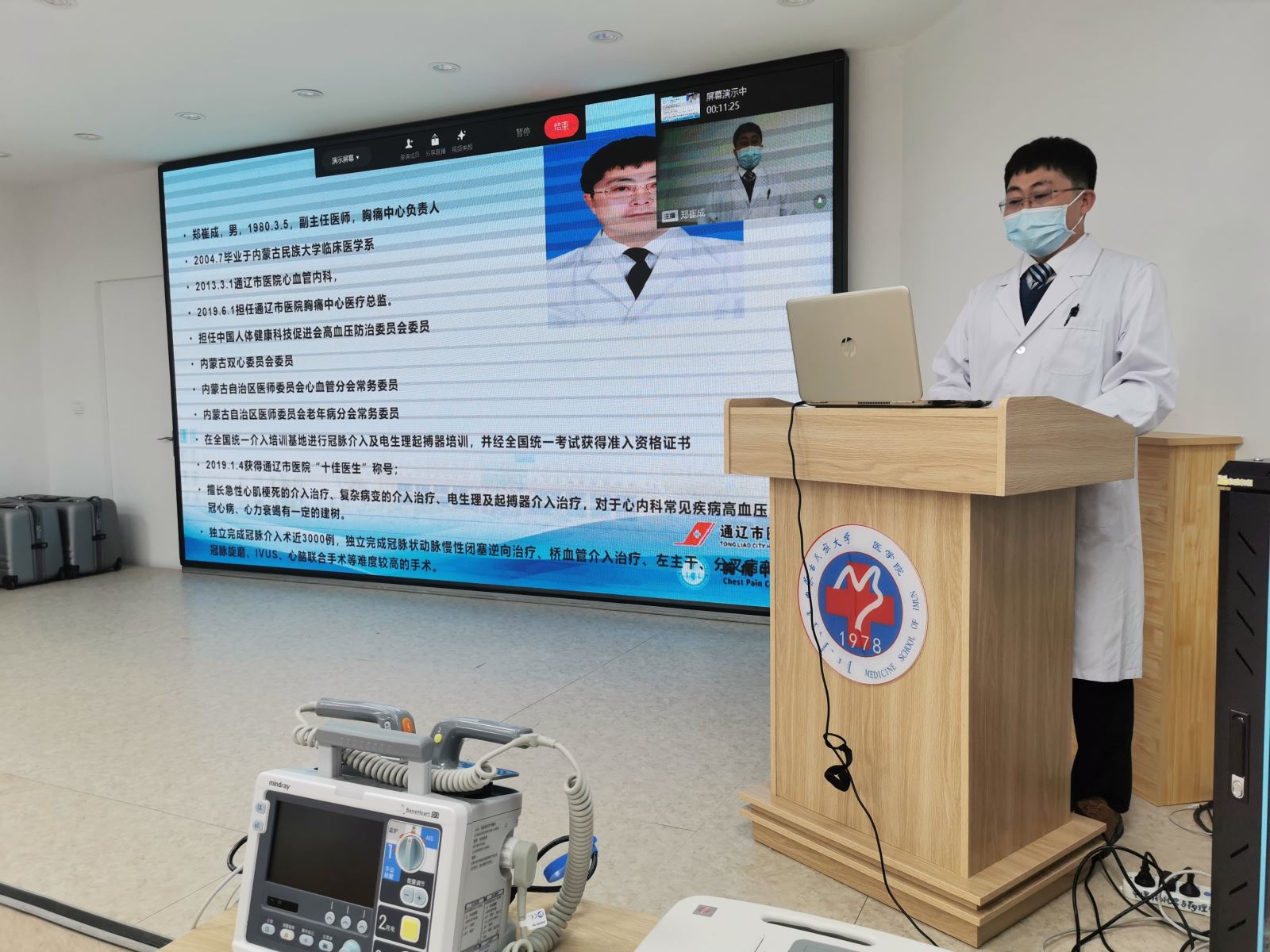 12月1日,胸痛中心全体医护人员在负责人郑崔成的带领下来到了内蒙古民族大学北校区,在基本医学楼会议室对在校学生开展急性心梗知识及救治宣教活动。首先,郑崔成医生介绍了我院的概况及我院胸痛中心的建设情况,详细讲解了急性心梗的诊断、治疗及介入治疗的优势和操作,为在场学生普及了急性心梗的应急处置知识。随后,邱龙医生进行了心肺复苏术技术培训,详细讲解了心肺复苏的操作步骤、意义和注意事项,现场进行心肺复苏演示,并将在场学生分为7组进行实操演练,每组有一名医护人员指导,使用模拟人手把手教会学生如何对心脏骤停患者启动救助程序及实施正确、规范的心外复苏按压。最后,郑崔成医生培训了心电图、除颤仪的适用症和使用方法,同学们积极踊跃,现场气氛热烈。