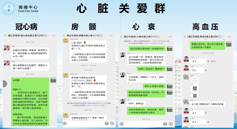 目前,我院根据心脏病按疾病种类建立四个群,即冠心病、高血压、心衰、房颤,基本涵盖了心脏疾病的90%以上,群内有国家总部专业团队进行打理,同时通辽市医院也派出专业的医生和护士共同经营管理此群。