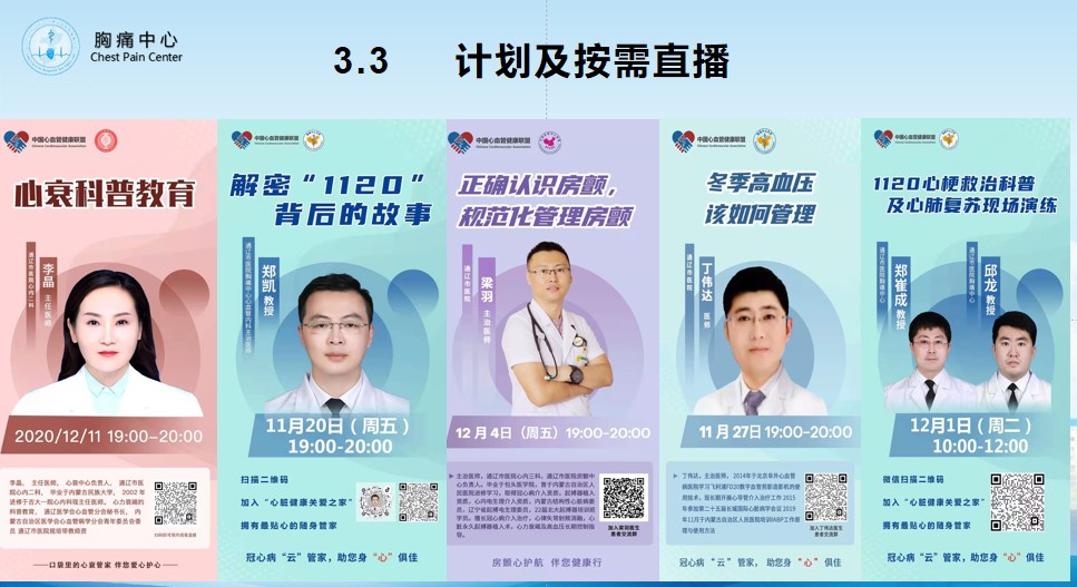 群的功能主要有三种,一是每天有科普疾病的文章,简单易懂,针对老百姓经常困扰的问题。二是胸痛中心总部定期在群内发布业界的大咖直播,同时跟群中的患者做视频互动、答疑解惑。通辽市医院医生也将定期在群内做相关的直播活动,目前已成功开展8期直播。三是群内设有打卡软件,陆续运行完善当中,譬如目前已经上线的高血压打卡软件和心衰病人打卡软件,可帮助患者在群内每天监测打卡,帮助我们更好的管理心脏疾病。