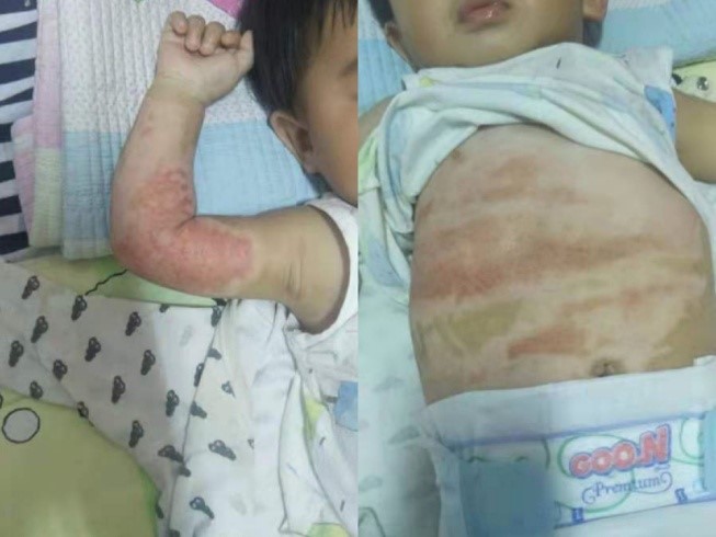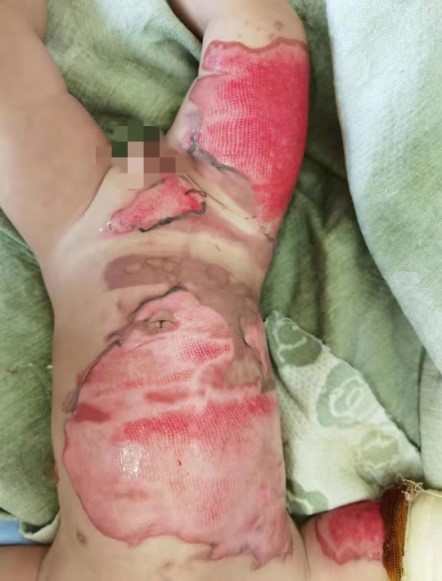 患儿林某,8个月,全身多处(右上肢、右下肢、臀部、躯干部)开水烫伤,烫伤面积占体表面积41%,深二度;入院时患儿神志淡漠,不哭闹,各烫伤创面大部分表皮脱落,创面基底红白相间,触痛迟缓。时间就是生命,值班护士急忙为患儿置管输液,接诊的林涛医生紧急处理创面,认真清创,敷药包扎治疗,并安置病房,吸氧,观察生命体征……由于孩子年龄小,烧伤面积大,创面深,孩子多次发烧,医务人员虽及时用药,物理降温,但创面渗出较多,大夫一天一次换药。经过精心治疗,虽然创面很大,但患者目前恢复状况很好,后期再经积极抗疤痕治疗,日后将不影响生长发育。患者家属激动地握住林涛医生的手,声泪俱下地说:“谢谢你们救了我孩子,谢谢你们的照顾,你们就是我们全家的恩人……”