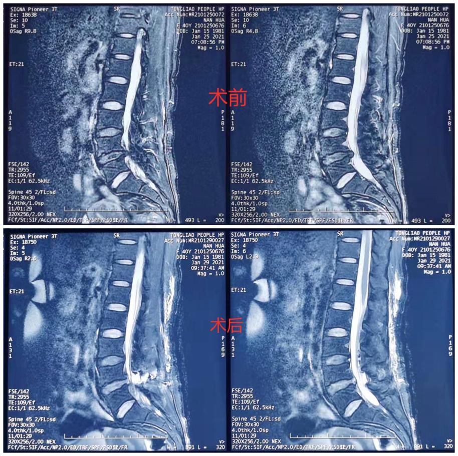 40岁的南女士有8年腰痛病史,自4月前开始,南女士时常会感受到右腿放射性疼痛、麻木。症状进一步加重,剧烈的痛感让南女士寸步难行,严重影响了她的日常生活与工作。带着巨大的病痛,南女士来到了我院骨四科就诊。查体显示南女士腰椎屈伸活动受限,右侧臀部肌肉较左侧萎缩,L3-4、L4-5、L5-S1椎体棘突叩击痛阳性,右侧臀部放射痛,双侧直腿抬高试验及加强试验阳性,右大腿后侧经小腿外侧至足外侧皮肤感觉减退、有麻木感;右侧踝及足趾背伸肌力下降。患者症状、体征与影像学表现相符,腰椎间盘突出伴椎管狭窄诊断明确。结合患者情况,我院骨四科燕飞主任决定舍弃传统手术方案,为患者实施一种新的微创手术治疗方案——双通道水介质脊柱后路镜椎间盘取出术。
