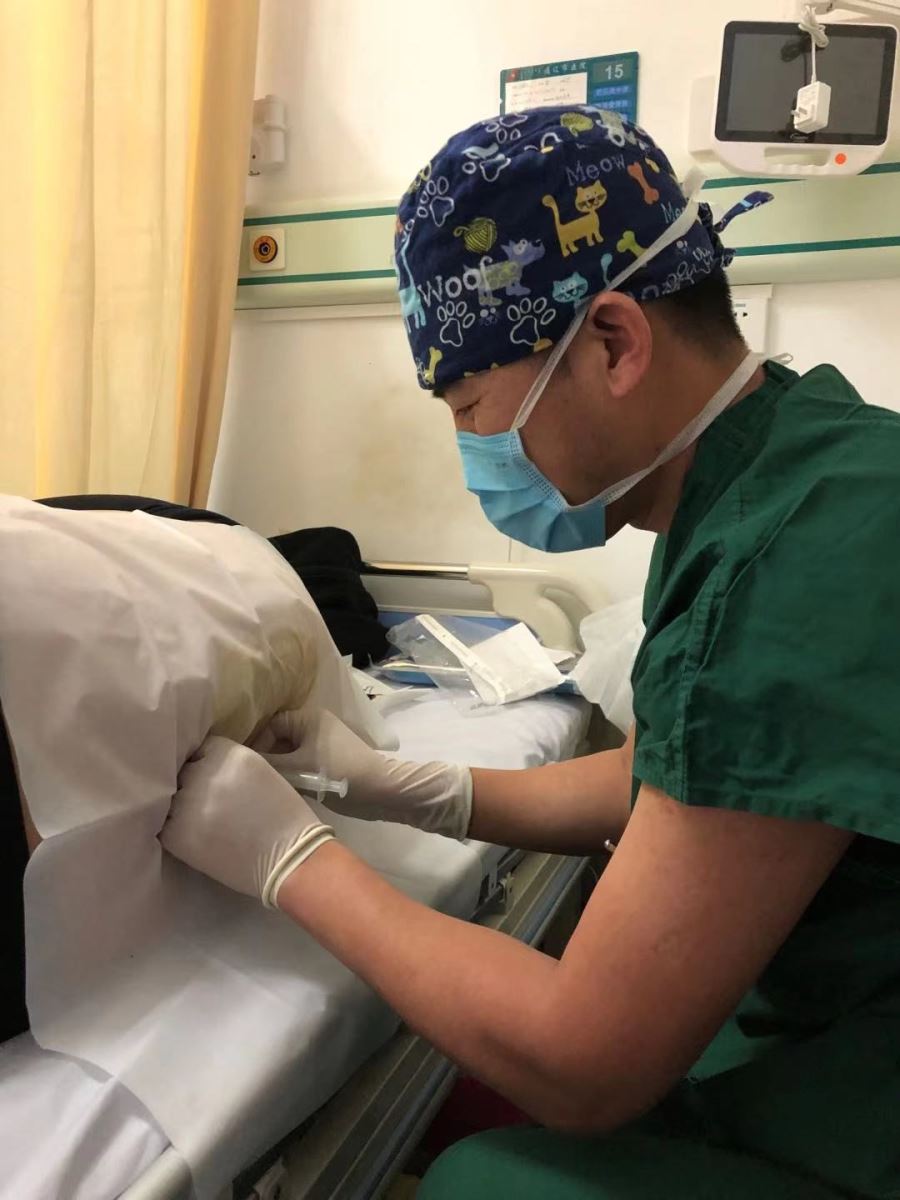 血液内科男性患者,28岁,体重133kg,被诊断为急性髓系白血病,经过一个疗程化疗后病情缓解。为预防中枢神经系统白血病,2月20日该患者需要行腰椎鞘内注射化疗药物。因患者过度肥胖,腰椎穿刺极度困难,主管医师经过穿刺未成功。鞘内注射化疗药物是预防中枢神经系统白血病的唯一有效途径,为达到良好的治疗效果,血液内科特邀请我院东院手麻科进行会诊,副主任医师高飞在科室工作繁忙的情况下到病房为该名患者进行穿刺。患者取左侧屈曲卧位,选择腰三、四椎间隙为穿刺点,2%利多卡因2ml于穿刺点逐层麻醉,麻醉成功后取9号穿刺针自穿刺点垂直进针,有突破感后停止进针,拔出针芯,见无色透明脑脊液流出,测初压为260mmH2o,留取脑脊液4ml分别送检脑脊液常规和蛋白定量。注射器抽取盐水3ml+甲氨蝶呤10mg+阿糖胞苷50mg+地塞米松5mg,缓慢鞘内注射。穿刺术中、术后患者没有不适,高飞医生用丰富的经验、娴熟的医技为患者的后续治疗奠定了坚实基础。同时,高飞医生对待患者耐心、细心的态度,得到患者及家属的高度评价,患者及家属也对我院医护人员为救治患者团结协作的精神给予充分认可。