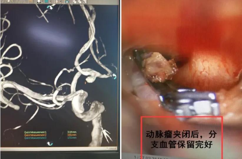 患者,49岁,男性,蛛网膜下腔出血后2天外院转入。嗜睡H–H 3级,DSA提示前交通动脉瘤。经充分的术前检查及准备、专家讨论等全面评估后,选择开颅夹闭术,并决定采用眶上外侧锁孔入路。与患者家属充分沟通后,于2月27日在我院东区手术麻醉科的通力合作下,历时数小时成功夹闭动脉瘤。术中,取眶上约5cm长横切口,为美容需要,切口隐藏于眉毛内,骨窗大小约2cm×1.5cm。由于时为出血后5天,属脑血管痉挛高峰期,脑组织有一定程度肿胀,神经外科手术团队凭借精湛的技术及完美配合顺利夹闭动脉瘤,吲哚菁绿造影血管无狭窄。还纳骨瓣,切口皮内缝合,整个手术过程顺利,并经手术一系列治疗后,患者恢复良好,体征平稳。