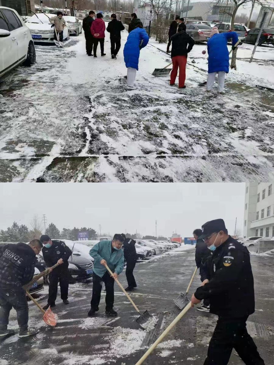上午,雪花依旧飞舞,虽然时值周日,但是院区内车辆仍然络绎不绝,路面厚厚的积雪经过车辆碾压,铲除起来非常有难度。但是大家不畏艰难与寒冷,顶着风、冒着雪,分工有序,配合默契,干劲十足。有的职工手拿铁锹,有的职工手拿扫帚,铲的铲、推的推、扫的扫,干得热火朝天,院区里呈现一片热火朝天、浴“雪”奋战的场面。大家一边清扫一边不忘维持车辆秩序,并提醒往来的就医群众:雪天小心路滑,注意安全。众志成城融积雪,真情奉献似暖阳,很快,我院各个院区就在大家的忙碌之下脱下了厚重的银装,换上了整洁的外衣。