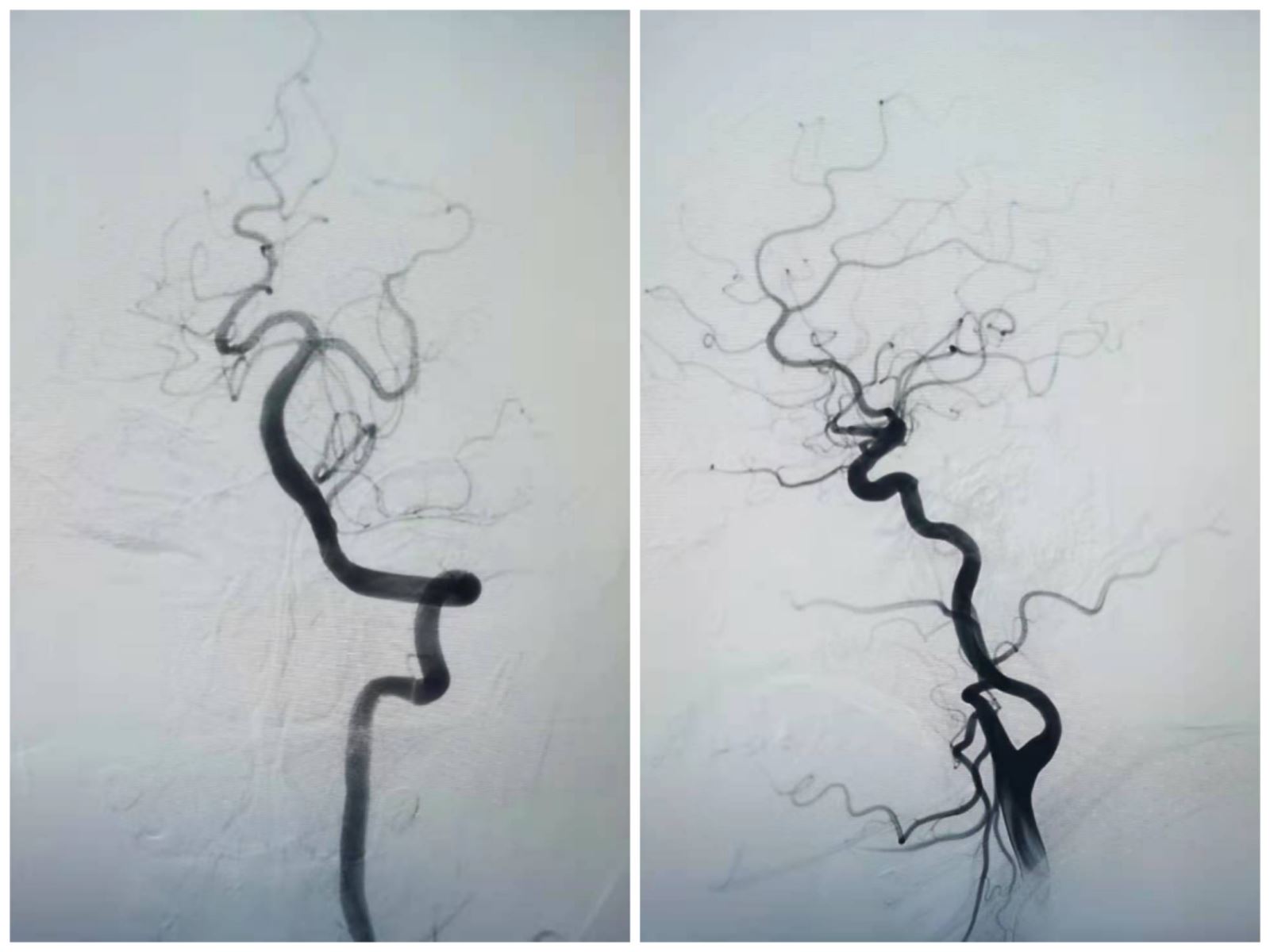 术中,胸痛中心负责人、心内三科负责人、副主任医师郑崔成,主治医师梁羽采用股动脉途径,予以行冠脉造影,造影结果显示:患者心脏冠脉病变严重,冠状动脉前降支近段闭塞,两位医生顺利通过介入方式直接开通闭塞血管,植入两枚支架,成功完成了心血管介入治疗,挽救了患者岌岌可危的心脏。随后,卒中中心团队副主任医师徐鹏、副主任医师张国锋继续采用股动脉途径,予以患者行脑血管造影,造影结果显示:脑血管前后循环大血管无明显狭窄,非取栓指征,建议内科保守治疗。经联合手术治疗后,患者胸痛、头晕、肢体无力等症状明显改善,状态良好,无不适症状。