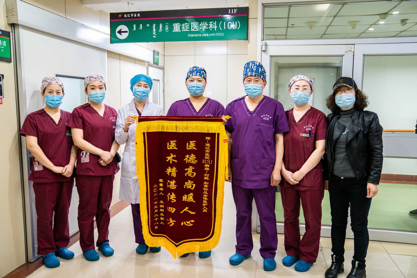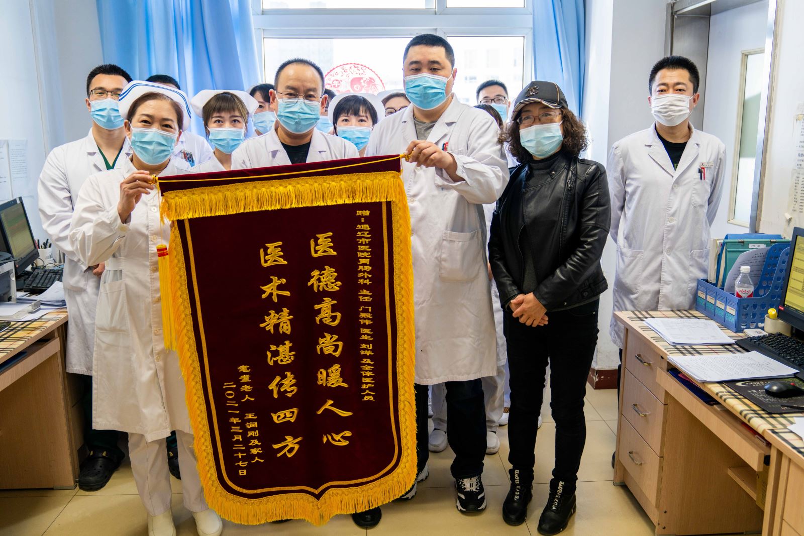 可是,当提及到患者家属的感激之情时,为患者精心制定治疗方案、不分时间随叫随到、充当大力士抬抱患者的胃肠外科主治医生刘洋;带领护理团队日夜坚守在老人身旁,细心观察老人病情的每一点变化,时刻准备应对突发情况发生的胃肠外科护士长王丽艳;有爱心、耐心,又特别贴心,知道家属看不到老人焦急的心情,每天耐心的给家属汇报病情变化、百问不烦的重症监护室医生刘磊;“老爷子,您是扛过枪、打过仗的民族英雄,这点小病打不倒您的,加油啊”每天为老人加油打气的重症监护室护士长贾春洁以及为了消除老人的孤独感而用呼市家乡话陪老人聊天的郭姓护士等等给予老人治疗及帮助的医护人员的回答却意外的一致:“我们只为患者平安。”是呀,你们用杏林春暖般的关爱,守护着每一位病患。因为,你善良,人美丽,心纯洁;你敬业,爱岗位,能吃苦;你奉献,用青春,写赞歌。你们有共同的名字叫——医者,你们有共同的精神叫——医魂。