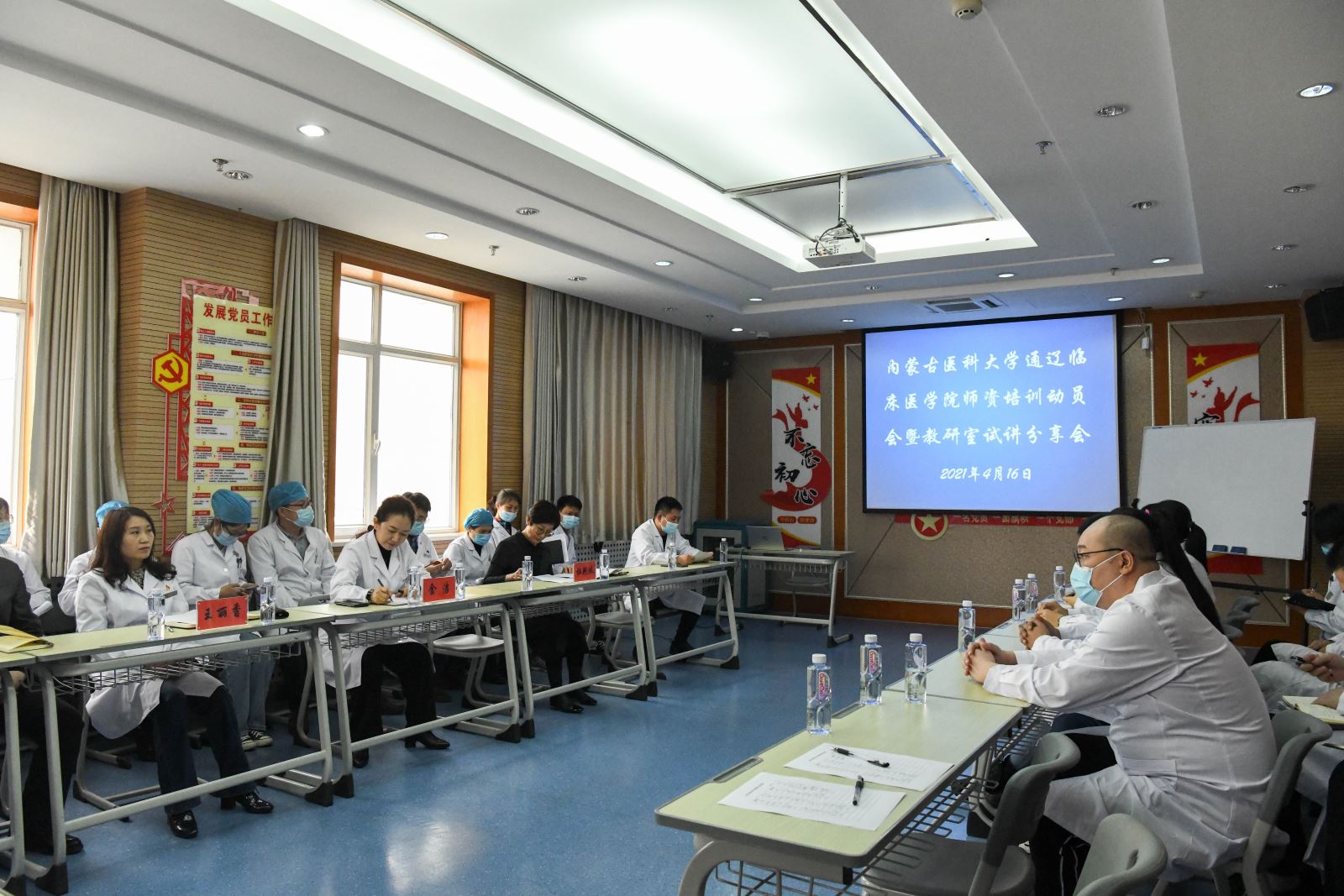为了顺利开展临床医学院教学工作,建设培养师资队伍力量,提高师资队伍教学质量,切实将党史学习教育成果转化到实际教学工作中,4月16日下午,我院内蒙古医科大学通辽临床医学院师资培训动员会暨教研室试讲分享沟通会在全科医师培训楼608室举行,我院党委书记金洁、副院长杜艳秋、副院长王丽香出席会议,各教研室主任、秘书及部分临床带教师资参加了动员会,会议由科教科负责人陈晓军主持。