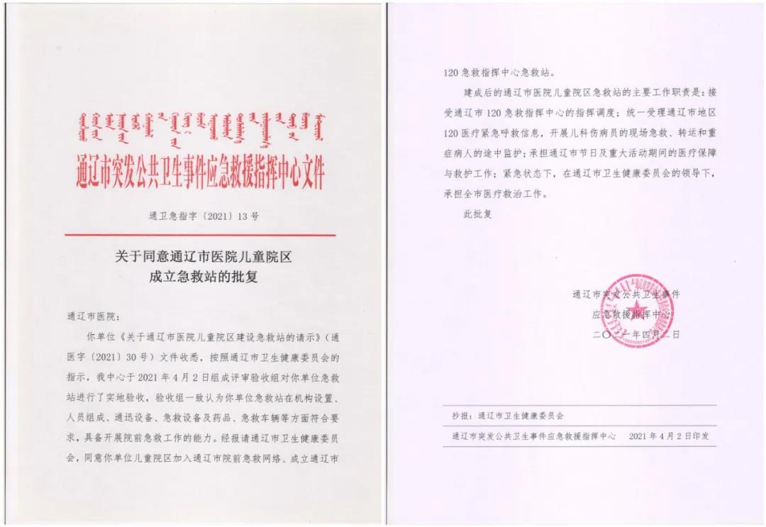 120急救是城市的生命线。为进一步完善通辽市医疗卫生服务体系,更好地提高医疗急救服务能力,不断在党史学习教育中悟思想、开新局,为群众办实事,经过紧锣密鼓的筹备,我院儿童院区急救站部署完成。4月2日,我院收到通辽市突发公共卫生事件应急救援指挥中心发来的《关于同意通辽市医院儿童院区成立急救站的批复》(通卫急指字[2021]13号)文件,标志着我院儿童院区正式加入通辽市院前急救网络,成为通辽市120急救指挥中心急救站之一。