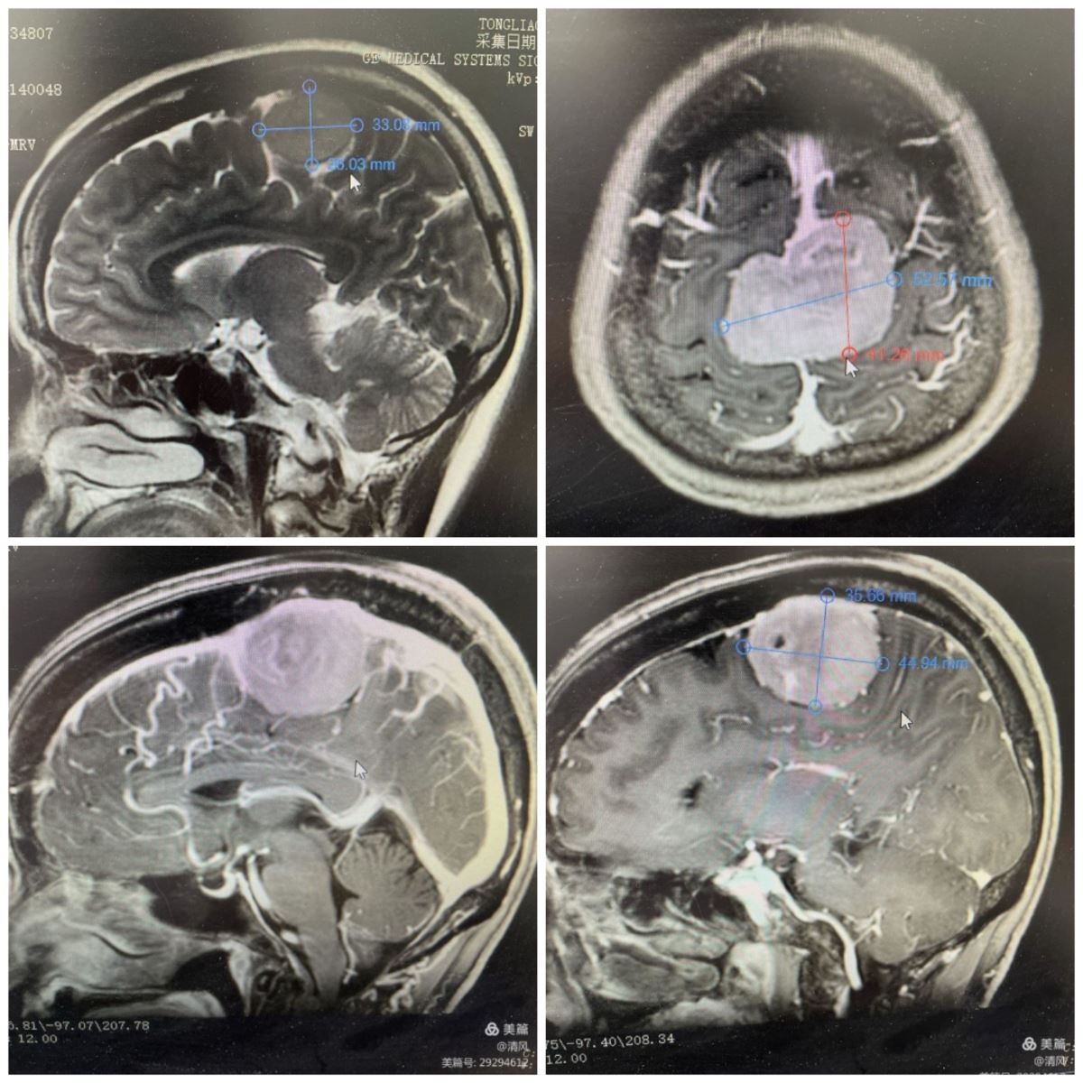 该病例患者,肿瘤长入矢状窦,且矢状窦未完全闭塞,手术力求能全切肿瘤,这样既能保证矢状窦通畅,又对周围功能区脑组织不构成损伤,不影响患者功能,让患者完整回归社会。秦义民主任带领全科人员,充分讨论,制定周密治疗计划、拟定详细手术方案及术中各项预案。秦主任和陈林、郭学富医生经过显微镜下长达12小时的手术,采用冠状切口,跨窦骨瓣开颅,术中见肿瘤横跨矢状窦,血运丰富,浸透大脑镰,长入矢状窦,行瘤内切除减压后,沿肿瘤边界小心分离切除肿瘤,最后打开矢状窦,切除长入矢状窦肿瘤,修补矢状窦,完全切除肿瘤。术后患者切口血运佳,愈合良好。术后第五天,患者神清语明,双下肢肌力4+级,已能独立行走,恢复良好。