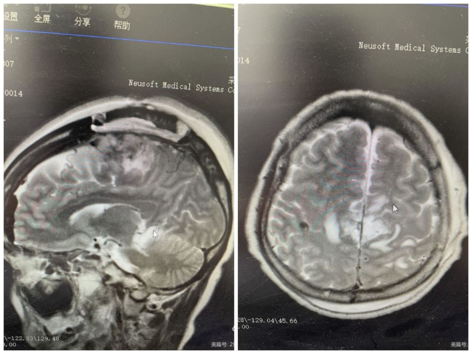 患者女性,55岁,颅内占位性病变10余年。近半年来,患者右上肢出现间断性麻木,到我院西院区神经外科就诊。经查体,患者生命体征平稳,神清语明,右上肢感觉稍减退。完善相关检查后,头颅核磁提示:跨矢状窦1/3占位,肿瘤血运丰富,与周围引流静脉关系密切。用3D软件行肿瘤与MRV重建,显示肿瘤与矢状窦、引流静脉关系密切。