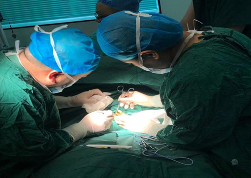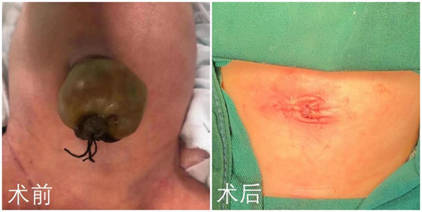 日前,刘女士在我院产科自然分娩产下双胞胎宝宝。因胎儿为早产儿,出生后大儿子体重1.91kg,阿氏评分3分(满10分者为正常新生儿,评分7分以下的新生儿考虑患有轻度窒息,评分在4分以下考虑患有重度窒息)。经过产科初步抢救复苏后转至我院新生儿重症病房进行进一步救治。新生儿科医生查体发现患儿脐带处有一大小约2cm×3cm的青色肿物,残端略渗血,到第5天时,患儿体重已降至1.7kg,脐部肿物颜色由青色逐渐变为绿色,局部发黑坏死,伴有少许黄色渗出物。在完善各项检查及化验项目,经小儿外科负责人宋希春会诊后,诊断患儿为脐肠瘘,若不及时治疗,会进一步导致患儿营养不良,电解质紊乱,可能会出现出血、肠管坏死等情况,甚至危及患儿生命安全。在与患儿家属进行充分沟通后,决定为患儿行脐肠瘘切除术。