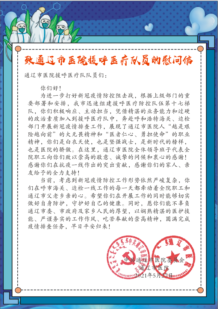 “根据疫情防控需要,你们积极响应、主动担当,凭借精湛的业务能力和过硬的政治素质加入到援呼医疗队中,你们是白衣天使,也是坚强的战士,是新时代的榜样,也是市医院的骄傲。……同时,希望你们不辜负通辽市委、市政府及家乡人民的厚望,圆满完成疫情排查任务,早日平安归来!”这是一封由通辽市医院党委和院委联合发出的《致通辽市医院援呼医疗队员的慰问信》,向我院正在从事呼和浩特海关、边检疫情排查工作的三位同志——闵颖、赵玉敏、杨敏致以诚挚的慰问和崇高的敬意,感谢她们在抗疫一线作出的突出贡献。