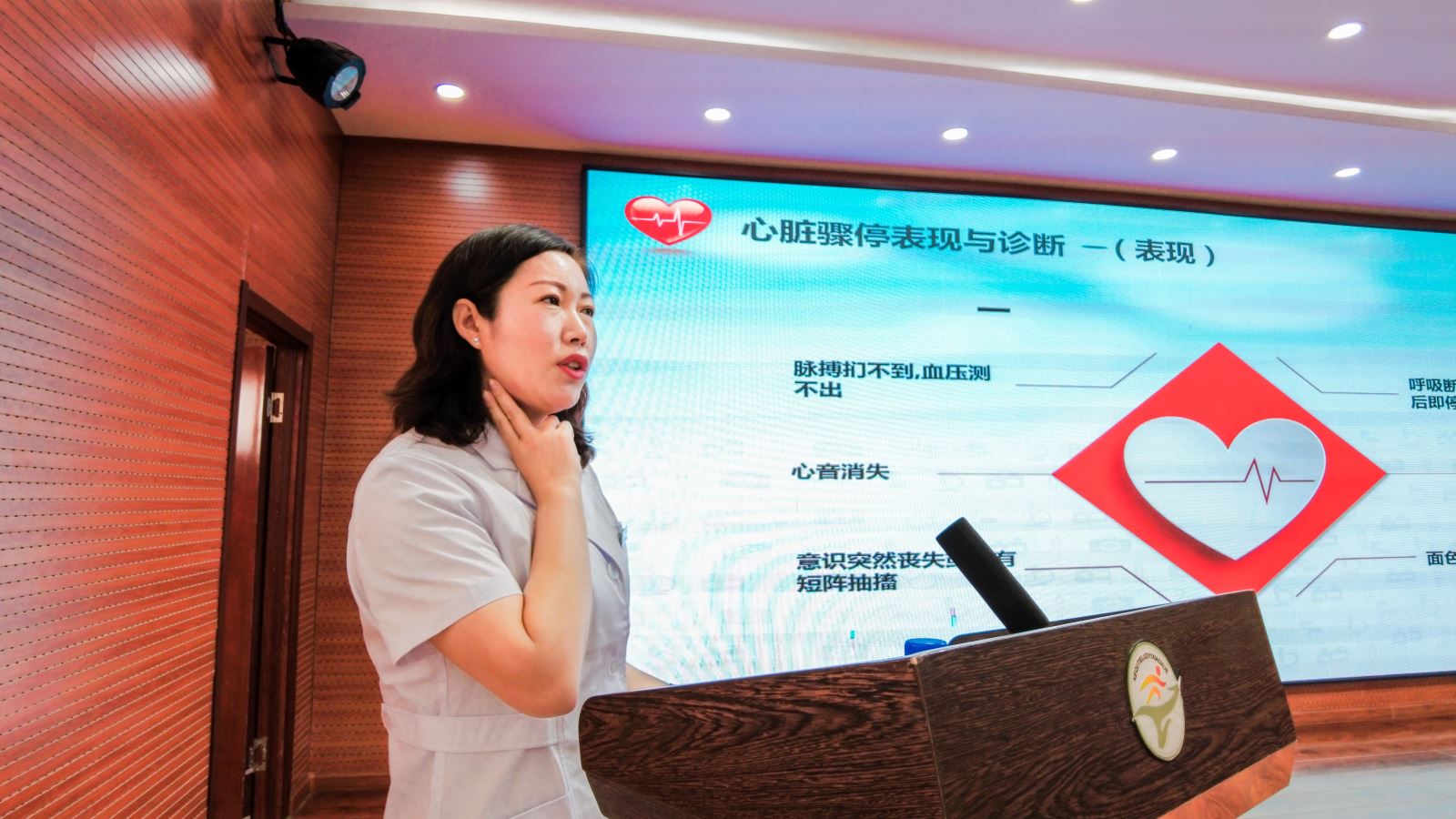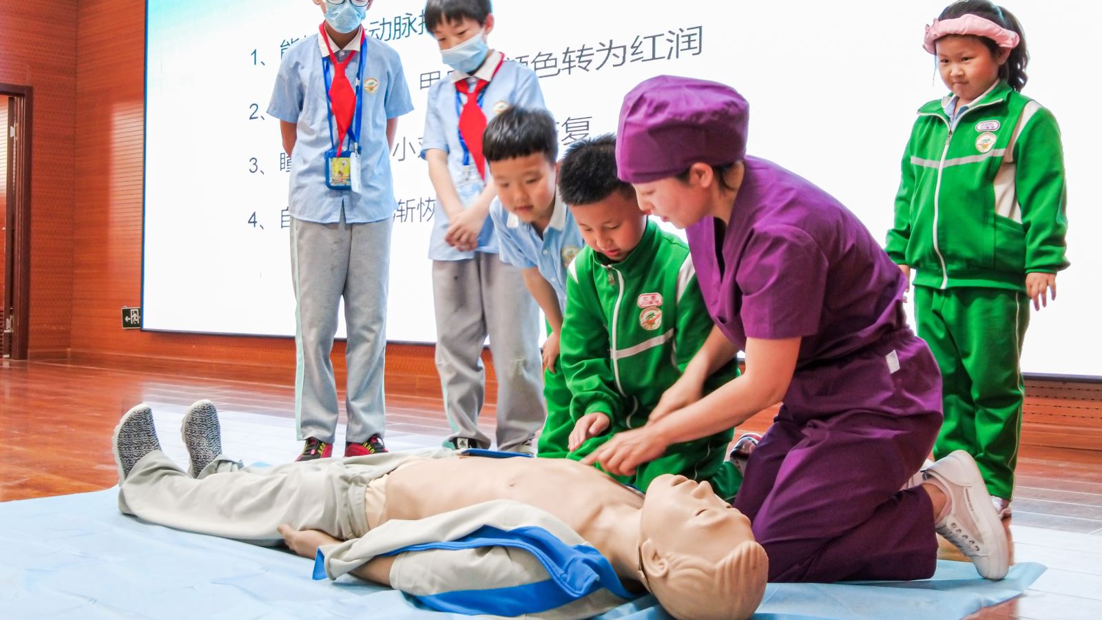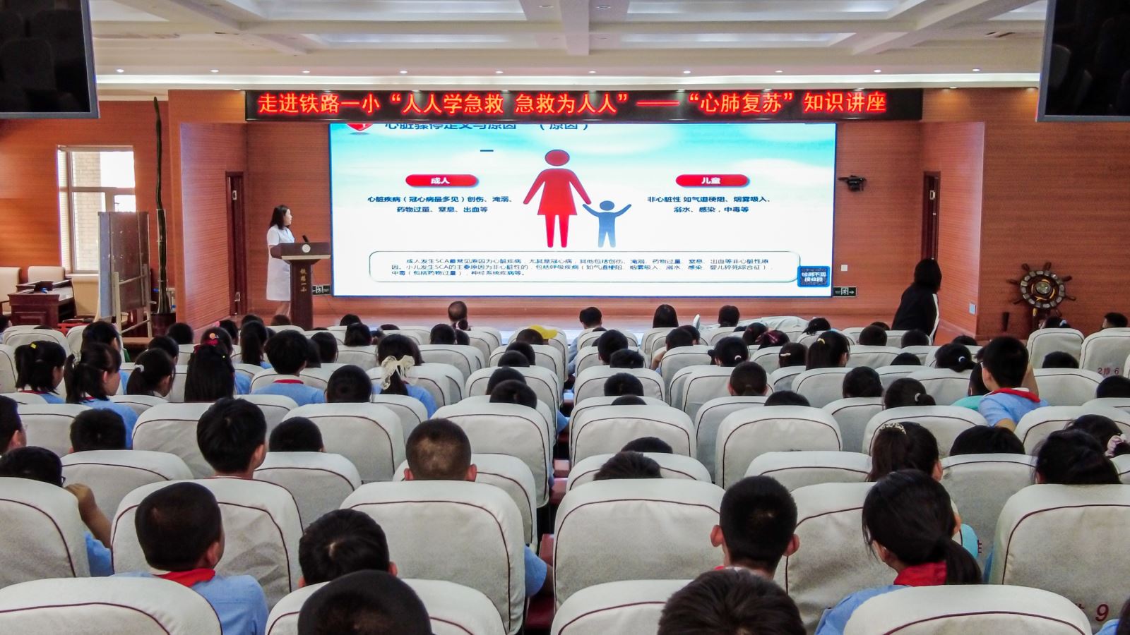 此次讲座分为理论讲解和实践操作两部分。尹雁娜医生以PPT的形式,用通俗易懂的语言,深入浅出、图文并茂地就心肺复苏的目的、心脏骤停的定义及原因、心脏骤停的表现与诊断、心肺复苏的操作方法做了详细讲解,讲解过程中王丹护士利用人体模型对心肺复苏的各个环节操作和技术要领进行了同步演示。示范结束后,尹医生邀请五名小学生上台亲身参与,体验急救过程,同学们踊跃参与,认真操作,虽然孩子们的动作略显稚嫩,小小的身体不能达到成人急救的标准力度,但在这次亲身操作中,在王丹护士一对一,手把手的教学实践中掌握了心肺复苏的正确方法,受益匪浅。