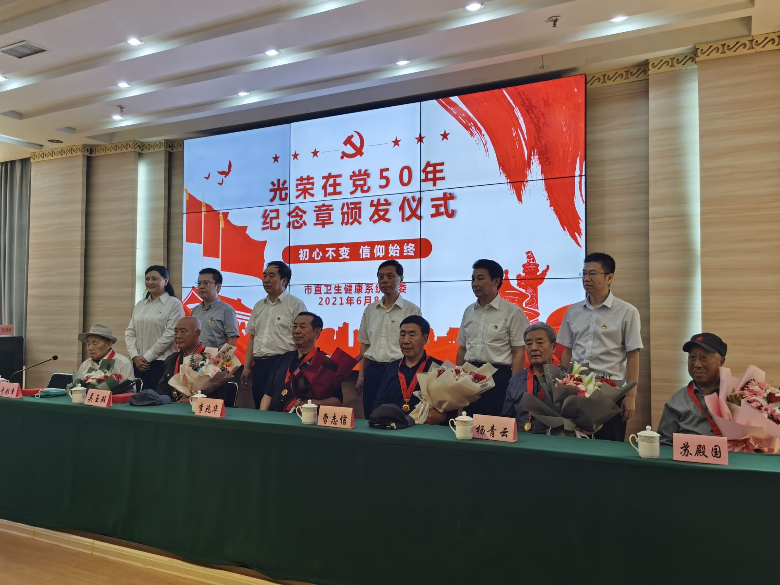 6月8日上午,市卫健委举行了以“初心不改,信仰始终”为主题的“光荣在党50年”纪念章颁发仪式。我院党委书记金洁、党办主任李鑫、老干部科科长钟文俊出席活动,我院老党员曹志信、杨青云作为代表参加了仪式。
