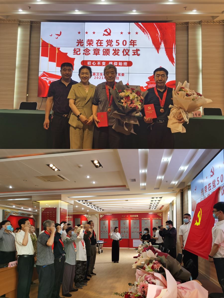 会上,卫健委党组书记、主任陈静向党龄50年的老党员表示崇高的敬意,她充分肯定了老党员们为党组织作出的突出贡献。她表示,老党员们用最朴素的行动,诠释了一名合格党员的责任与担当,同时激励所有党员不忘初心,继续前进。随后,卫健委和组织部与会领导为老党员颁发纪念章并送上鲜花,我院退休老党员曹志信接受了这一荣誉。会议最后,全体党员面向鲜红的党旗,紧握右拳,以昂扬的斗志和饱满的热情,铿锵有力地宣读了入党誓词,重温对党庄严而神圣的誓言。