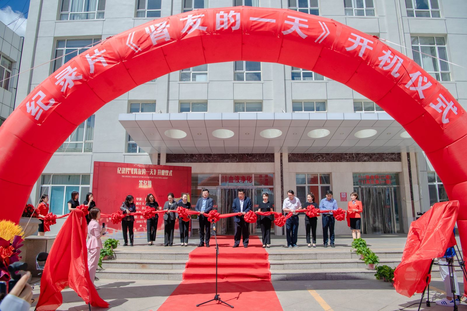 开机仪式由我院血液净化中心护士何盼主持。仪式上,市人大教科文卫委员会程惠民主任、内蒙古民族大学文学与新闻传播学院王振宇书记、我院杜艳秋副院长分别为开机仪式致辞。随后,全体领导上台,共同为《肾友的一天》开机剪彩,主持人宣布纪录片《肾友的一天》正式开机。剪彩过后,主创导演徐颖涛、我院血液净化中心主任白刃对纪录片的拍摄初衷、目的和意义进行了详细介绍。最后,内蒙古民族大学文学与新闻传播学院郝青云院长、我院金洁书记为《肾友的一天》开机揭红,与会工作人员为在场的嘉宾分发火龙果和橙子,寓意嘉宾们红红火火、心想事成,开机仪式在一片欢乐的气氛中圆满结束。