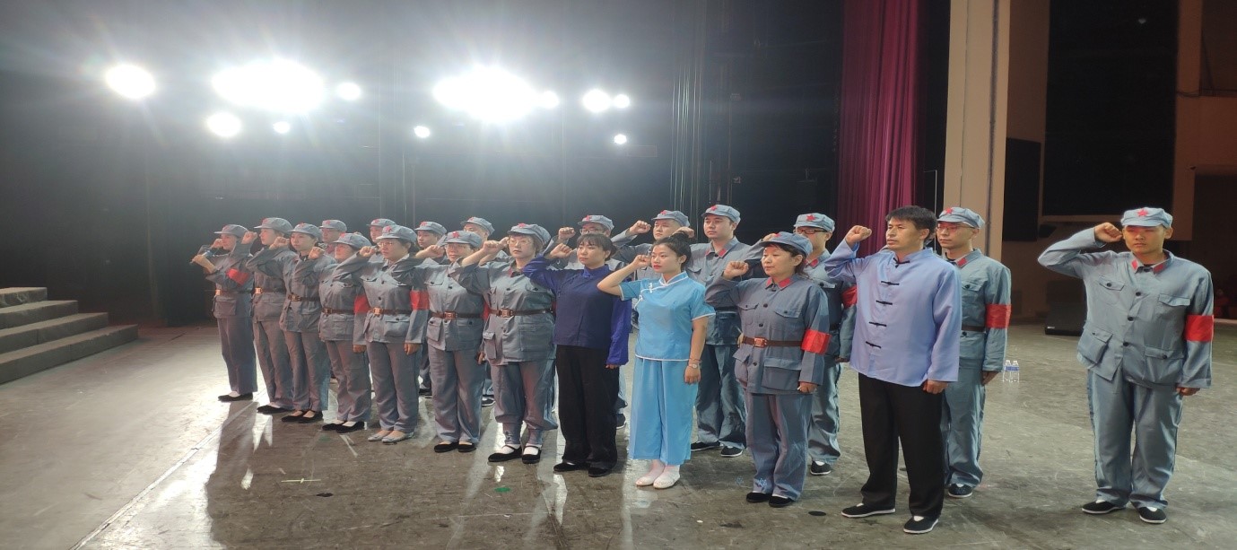 百年征程波澜壮阔,百年初心历久弥坚,在党的百年华诞即将到来之际,为进一步增强全体党员队伍的凝聚力和战斗力,坚定理想信念和历史责任感,我院第十党支部党员在辽河剧院排练庆建党100周年文艺汇演节目时,身穿红装,面对鲜红的党旗重温入党誓词,向党再表忠心、再诉衷情。