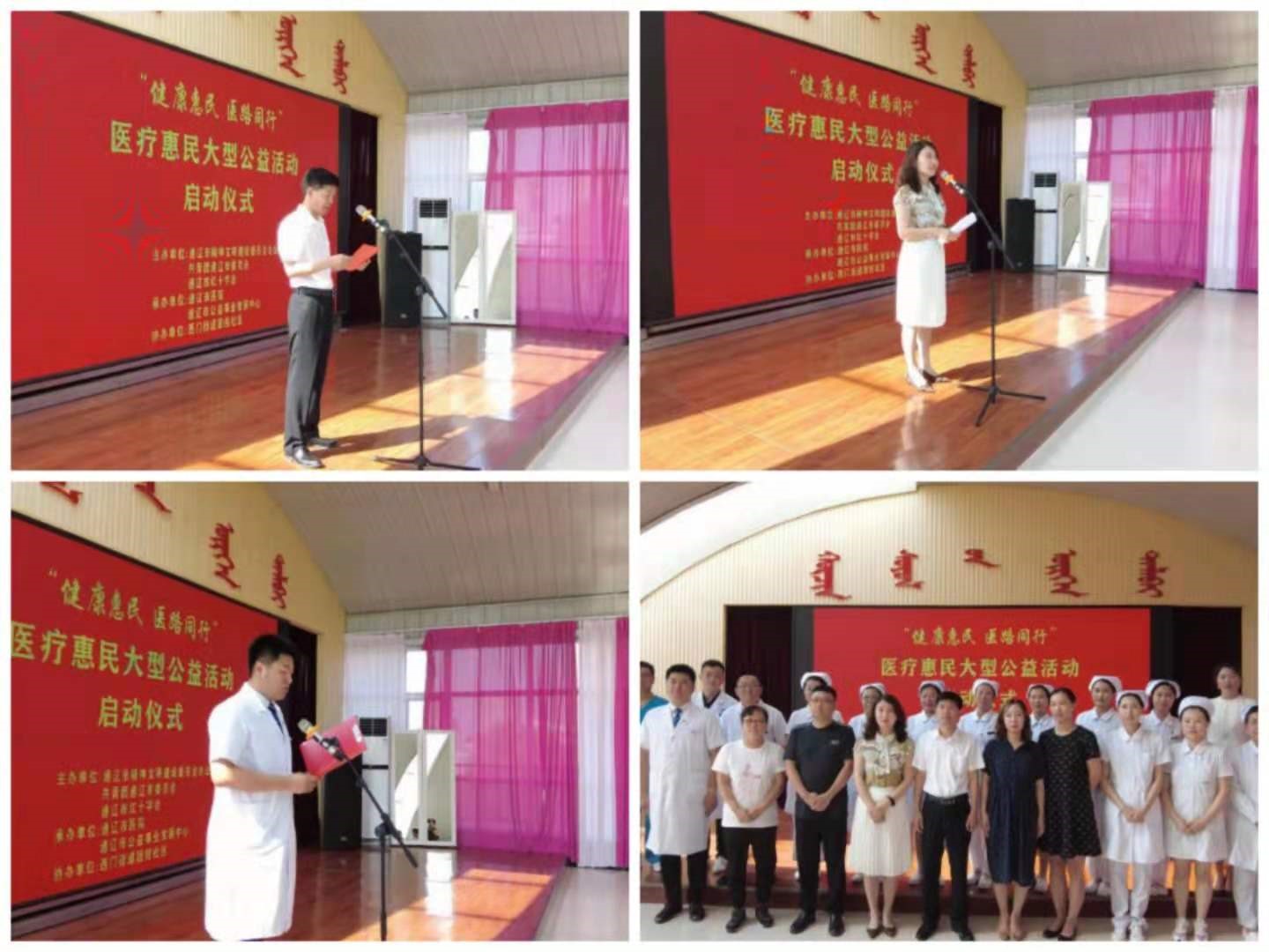 为深入推进“我为群众办实事”实践活动,帮助百姓提高预防疾病意识,加强科学就医能力,真正落实惠民政策,树立全民个人健康责任意识,7月24日,由我院和通辽市公益事业发展中心共同发起,通辽市精神文明建设委员会办公室、共青团通辽市委员会、通辽市红十字会主办,我院和通辽市公益事业发展中心联合承办的“健康惠民 医路同行”大型医疗惠民公益活动启动仪式在东方世纪城西门街道社区隆重举行。通辽市委宣传部副部长、市精神文明办公室主任何建华,我院副院长王丽香,通辽市精神文明办公室综合科科长刘晓瑶,共青团通辽市委宣传科科长耿炜然,通辽市红十字会组织宣传筹资部负责人赵丽明,通辽市公益事业发展中心主任王博出席仪式。王丽香副院长为启动仪式致辞,我院医疗志愿者代表姜勇宣读倡议书,何建华主任宣布本次公益活动正式启动。