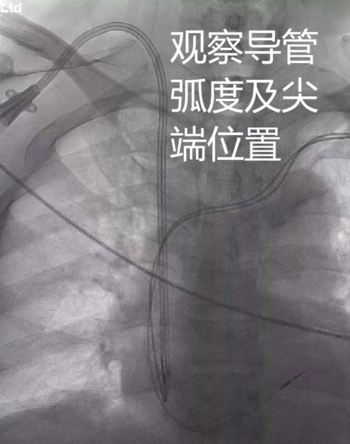 血液净化中心通路组姜晖医生和许若男医生采取“上腔静脉造影+右颈内静脉带隧道导管植入术”,造影显示患者上腔静脉、右心房有无狭窄,起搏器电极位置良好,置入导管,使起搏器与透析管在心脏相见,各司其职,互不影响,共同守护患者生命。术后患者透析顺利,起搏器工作正常,无任何不适感。