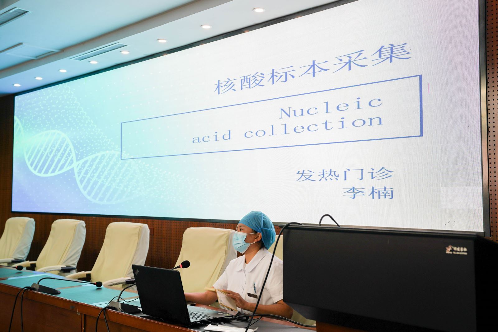 培训由发热门诊护士李楠进行授课,她以PPT的形式配合生动详实的讲解和规范标准的采样展示,为参培人员讲解了核酸采集方法、试剂的选择、采集前对患者的询问与告知、采集注意事项、如何正确使用防护设备等相关内容,并现场观看了核酸采集与防护服穿脱流程的教学视频。培训结束后,门诊部对参培护理人员进行了考核,确保做到人人掌握,人人过关。