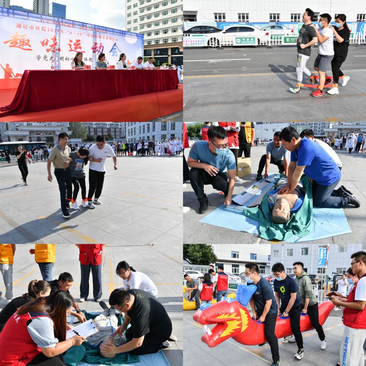 平时,医生的工作辛劳忙碌,鲜有时间放松,但是8月18日我院召开的一场别开生面的趣味运动会,却给医生们提供了纾解日常繁忙工作压力的好机会。本次比赛采取接力赛的方式进行,不但通过丰富多彩的道具考验着各位临床医师的体力,更在各接力节点上设置了核心制度知识问答、三基试题等“脑力比拼”环节,最后一个节点上,还别出心裁地安排了为模拟人进行心肺复苏抢救的场景,最终需要四位选手抬着担架赶往终点。活动现场加油声、欢呼声此起彼伏,大家欢声笑语享受着运动的快乐。通过此次比赛,不但锻炼了医师的身体和临床思维,更重要的是增强了大家的凝聚力和向心力,让我院的医师能够以更加饱满的精神热情投入到日常工作中去。