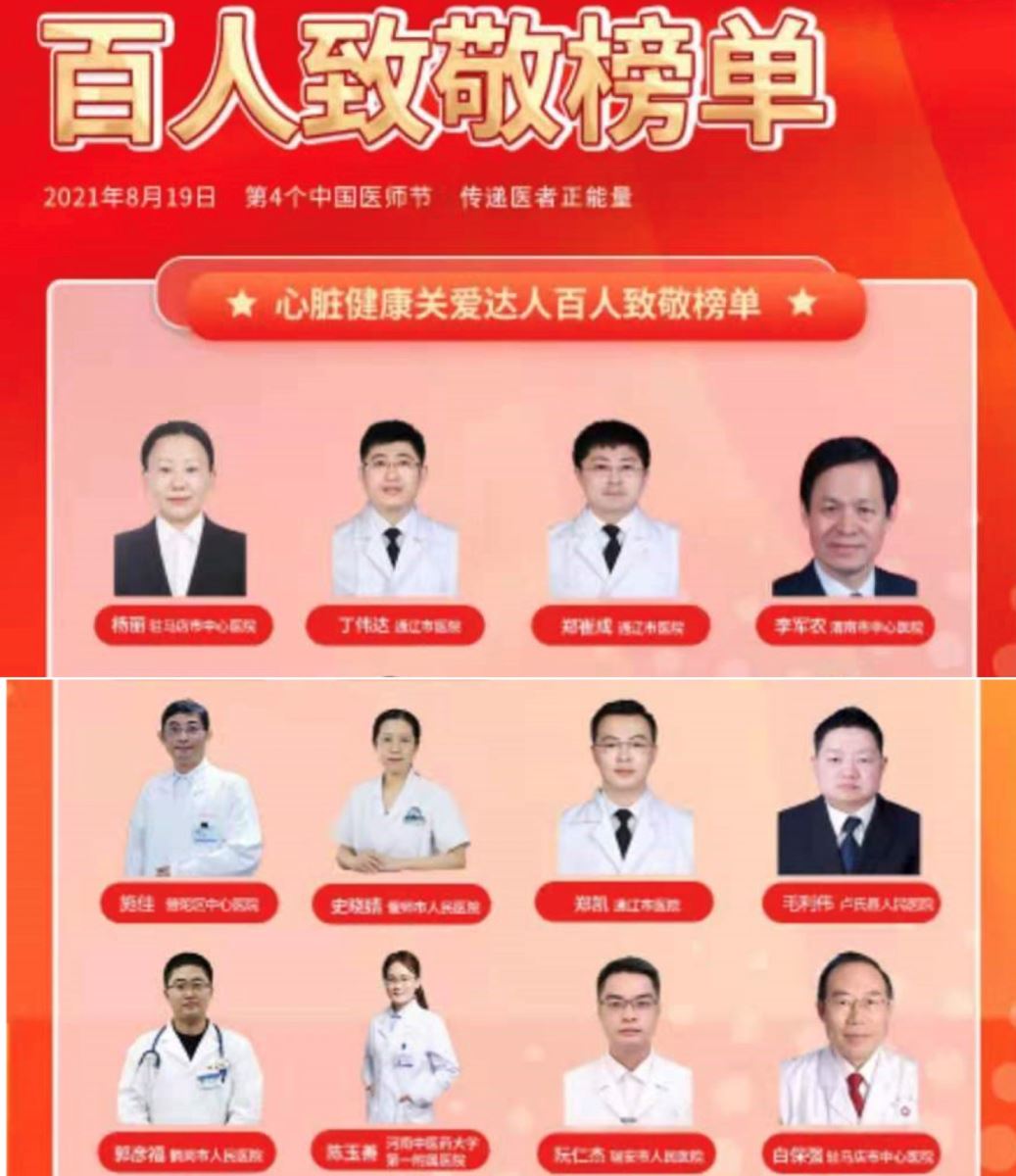 为致敬医师节,传播正能量,近日,心血管健康联盟发布了“心脏健康关爱达人百人致敬榜单”,旨在向长期以来奋斗在心血管疾病“防、治、救、康”战线上的优秀医师表示衷心的感谢并致以崇高的敬意,我院胸痛中心、心内三科负责人郑崔成,高血压达标中心负责人、心内一科主治医师丁伟达,胸痛中心救治单元负责人、心内三科主治医师郑凯荣登榜单。