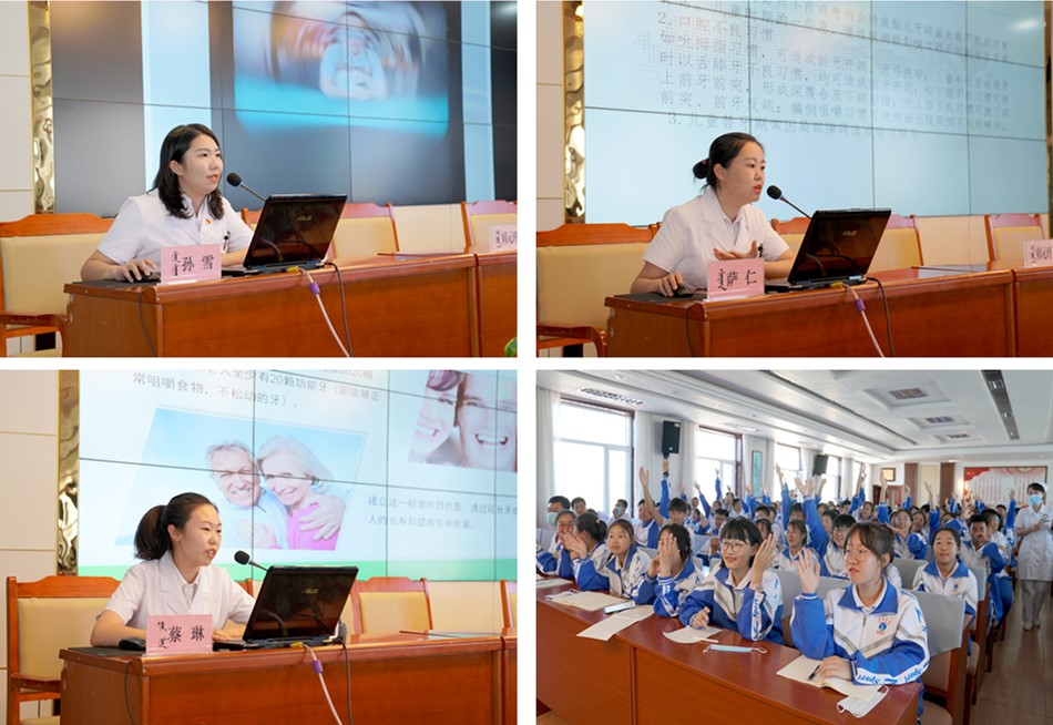 活动现场,来自我院口腔科的主治医师孙雪、萨仁、蔡琳分别作了题为《青少年常见口腔疾病及预防》《青少年常见的错颌畸形及其矫治》《阻生牙的危害》的科普讲座,医生们用活泼幽默的语言、形象生动的图片,从龋齿、牙周牙龈健康、牙齿排列不齐等与青少年们息息相关的多个口腔问题为学生们上了一堂生动有趣的爱牙护牙的健康教育课。现场的同学们被讲座深深吸引,当看到因没有认真刷牙造成的各种牙病和因错颌畸形造成各种面部缺陷的照片时,同学们不时发出惊讶的呼声。讲座结束后,我院口腔科的医生们还以有奖问答的方式,就健康牙齿的标准、基本结构、种类、蛀牙的危害及怎样正确刷牙、如何保护牙齿等方面与现场的同学们进行了热烈互动。