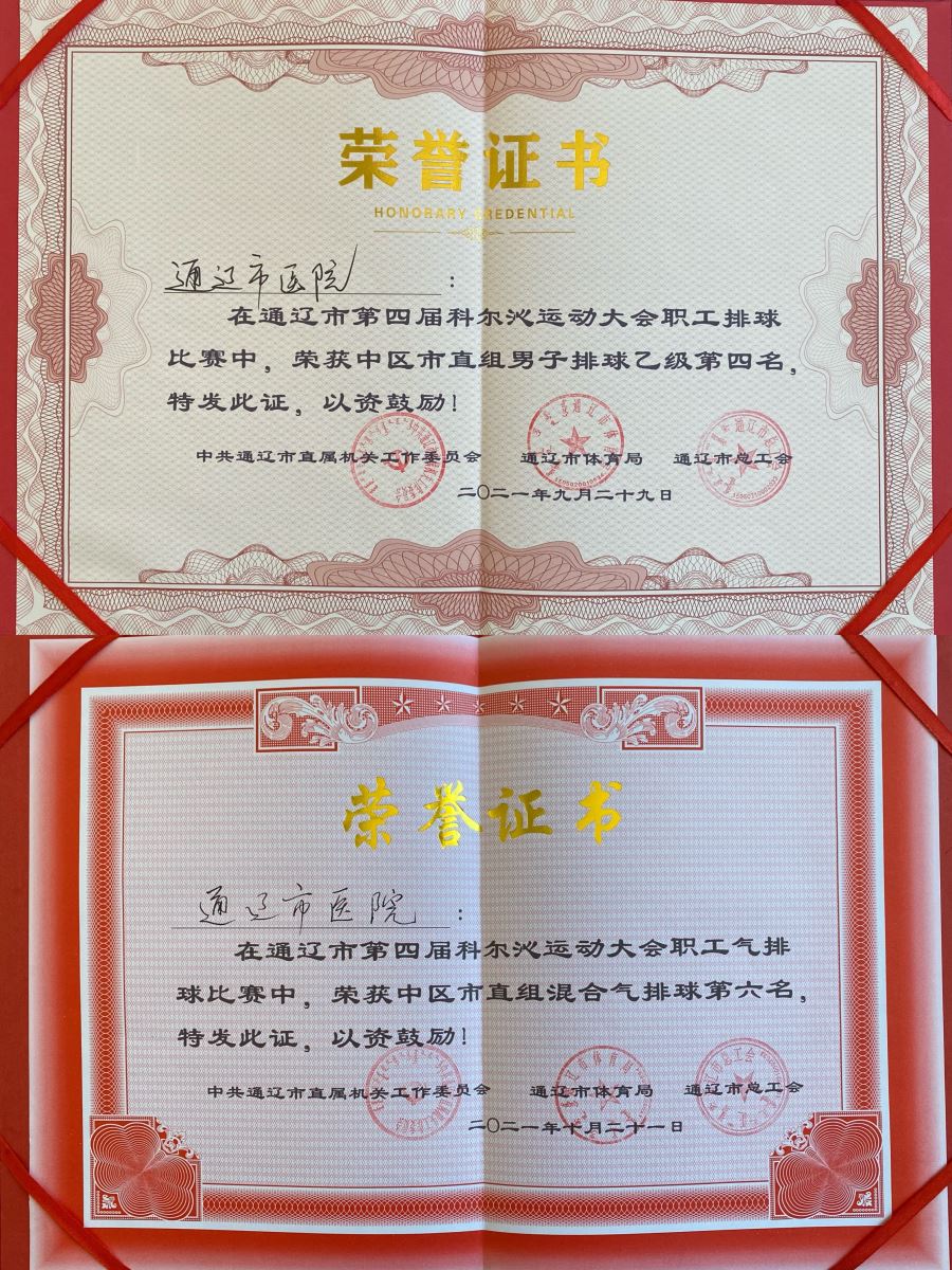 近日,在由通辽市人民政府主办,中共通辽市直属机关工作委员会、通辽市体育局和通辽市总工会承办的“献礼建党百年 畅享体育盛会”通辽市第四届科尔沁运动大会中,我院职工积极参赛,荣获中区市直组男子排球乙级第四名,混合气排球第六名的佳绩。