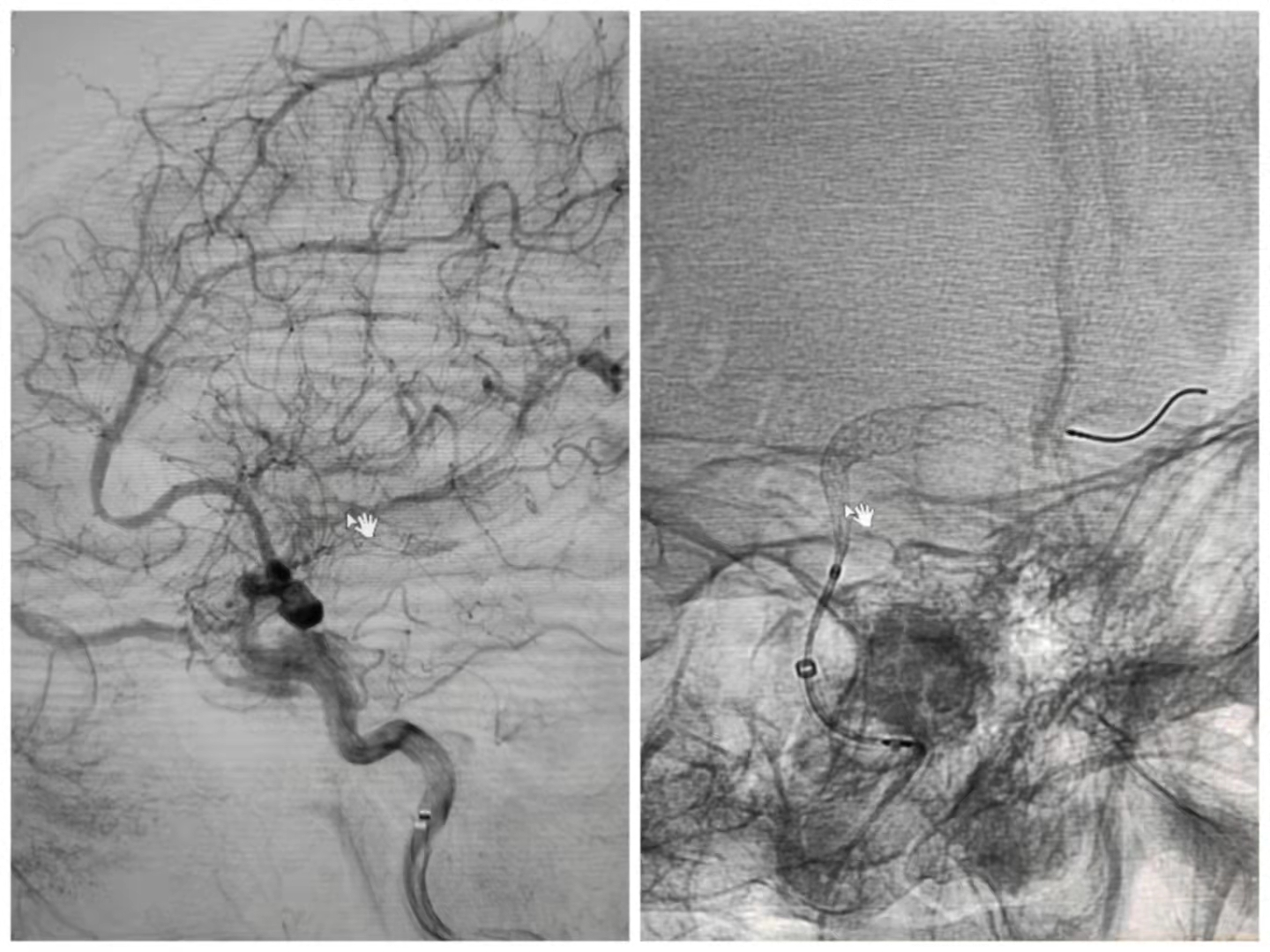 患者是一名64岁女性,因头痛在当地旗医院查CTA诊断为左侧后交通段宽颈动脉瘤,随后到我院神经外科进行治疗。颅内动脉瘤被称为颅内不定时炸弹,是常见的颅内血管疾病,严重威胁人类的生命健康。传统的治疗方法对于复杂的颅内动脉瘤(如巨大动脉瘤、宽颈动脉瘤及血泡样动脉瘤)治疗难度大、风险高且易复发。针对病人的情况,神经外科组织术前讨论,最终决定为病人实施血管导向装置(密网支架)植入术,邀请宣武医院叶明主任医师指导手术,我院神经外科副主任医师呼和巴特尔实施手术,手术过程顺利,术后患者意识清醒,无神经功能障碍,造影显示动脉瘤内造影剂明显滞留,身体恢复较好,活动自如。