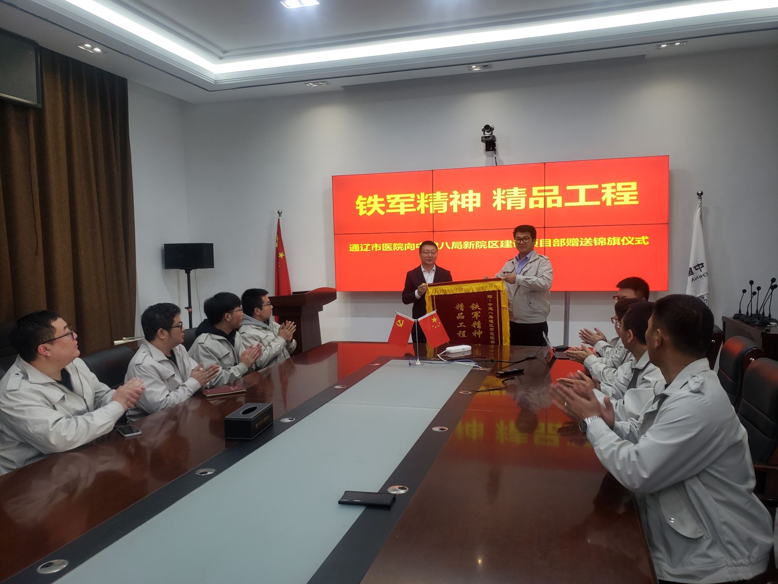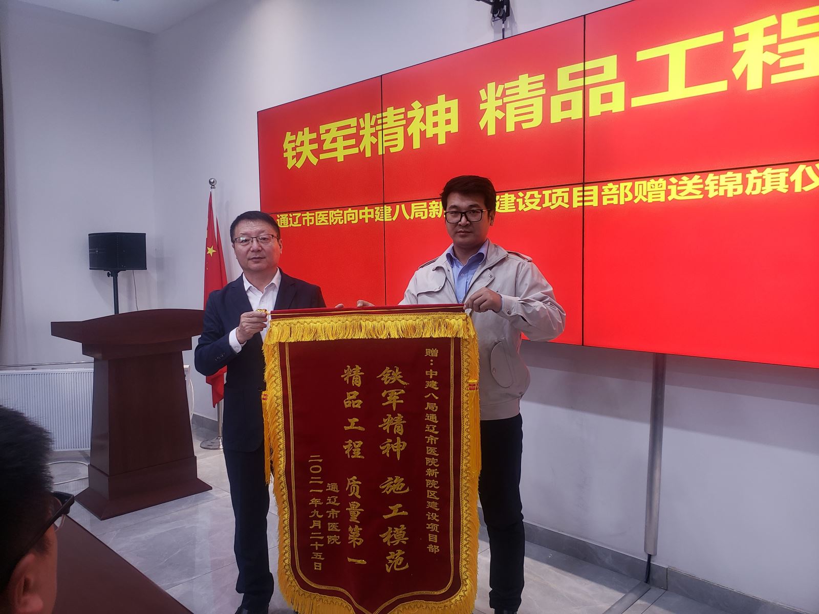 11月3日,我院张双青副院长受医院党委委托,赴新院区项目建设现场,赠予中建八局通辽市医院新院区建设项目部“铁军精神 施工模范 精品工程 质量第一”的锦旗,以表彰八局为项目建设尽职尽责的工作态度和顽强拼搏的奋斗精神,项目部执行经理李统接受锦旗,并表示将继续秉持精益求精的工匠精神,发扬“令行禁止使命必达”的铁军精神,凝聚共识、拼搏奋斗、攻坚克难,全力确保项目的完美落成。
