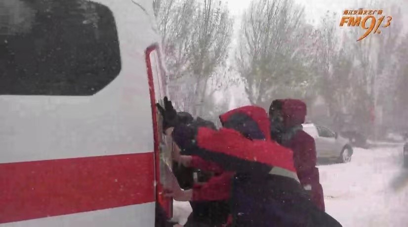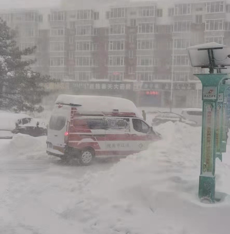外面大雪纷飞,急诊的救援任务也是一个接着一个,他们24小时待命,一次次出诊在这漫天飞雪中。11月8日,74岁的肿瘤术后患者在家突发呼吸困难,救护车立即出发,当时正值暴风雪肆虐之际,救护车行进不到500米便被困在雪里,出诊医护和司机立即拿着事先放在车里的铁锹,原地铲雪,推车,没有路铲也要铲出一条路,但无论医生多想快一点达到现场,救护车仍是行进缓慢,只好求助消防,医护人员手拿急救箱和担架下车,还是最原始的办法,用脚征服这片雪地,哪怕能快一分钟也行……最后,在消防车和社会爱心人士的帮助下,老人及时被送往医院,成功挽救了患者生命。