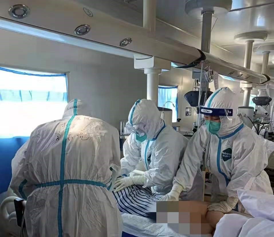 有一个比较严重的男性患者,无意识,经口气管插管机械通气,颈内静脉置管,连接的输液泵就有至少4到5组,桡动脉置管监测有创动脉血压,留置胃管、尿管等各种管路,保持俯卧位不少于16小时。为了使患者安全、顺利更换卧位,至少需要我们5个护士协同完成。因为我们都穿着防护服,戴着眼罩、双层手套,导致行动起来非常不方便,所以大伙都加倍小心,确保各组管路通畅的前提下,为患者完成翻身,避免患者的皮肤长期受压发生压疮。