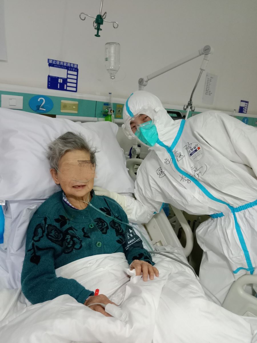 还有一位80岁高龄的老奶奶。前期病情比较严重,甚至还发生过抽搐,有时记不清人和事,多年的白内障病史让她基本上处于失明状态。这一系列因素加起来,使得奶奶情绪非常焦虑,不信任任何人,也不配合我们的治疗和护理工作,更是不怎么进食。这样的情况让我们十分着急,在交接班时大家一起商量对策。我们通过言语沟通关心老人的生活、病情情况,通过按摩、抚触等肢体接触增加老人对我们的熟悉感,尽可能让老人放松下来,增加她的安全感。在我们的共同努力下,老人逐渐配合治疗,饮食上每顿饭也都吃得特别香,经过一段时间的治疗,奶奶的核酸检测结果连续2次阴性,体温正常,呼吸道症状咳嗽、咳痰明显减轻,肺部阴影明显好转,达到出院标准。经过医生和专家的会诊后,奶奶要转入康复医院进行下一步康复治疗。当医生告诉她可以出院的时候,她非常开心,对我们说着谢谢,这一刻,我体会到了作为一名护士的幸福。