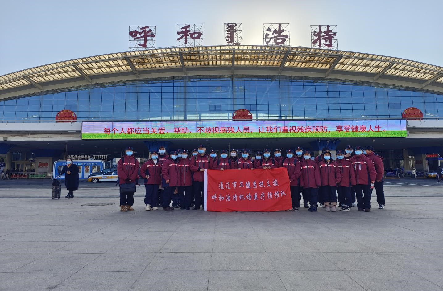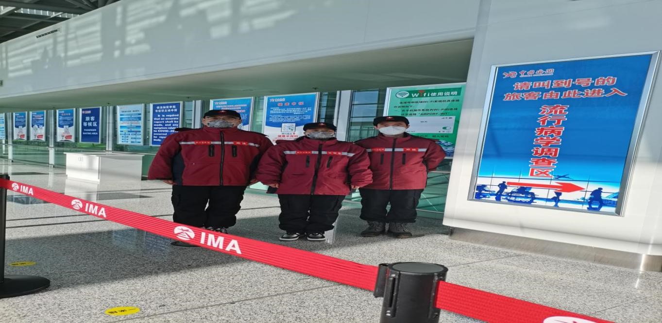 18日早6:30 ,我们准时集结队伍登上大巴奔赴机场,经过仔细地安检后 到达指定区域,迅速穿戴好防护服、面罩、口罩,赶赴工作岗位。