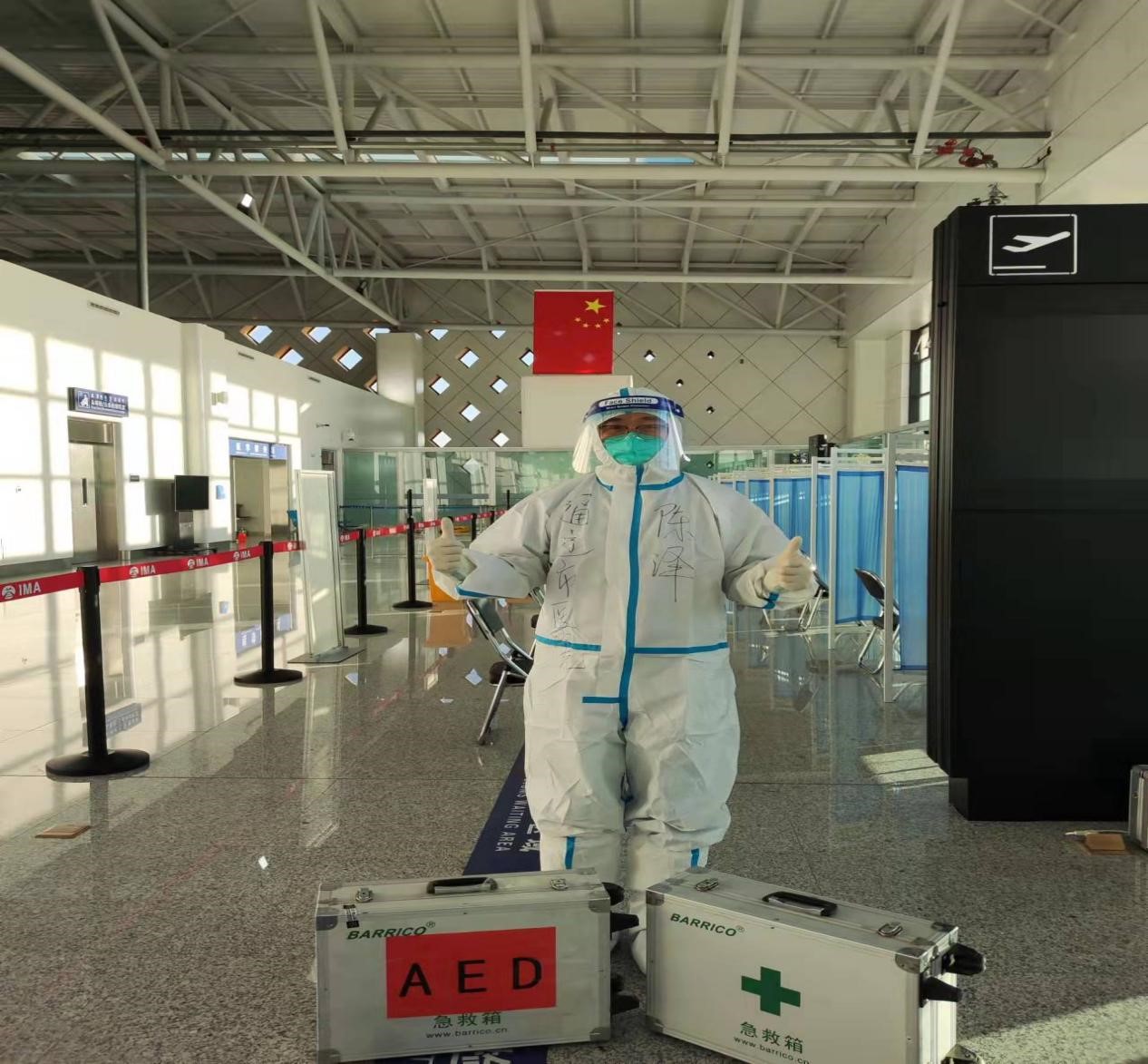 16日、17日进行了闭环防控岗前培训,我们从穿脱防护服到熟悉场地、工作流程等开展实地演练。我和王莹莹、郑楠医生进入流调组,协助查验健康申报,全面开展体温监测筛查,严密实施医学消杀工作。因为有急诊、ICU的工作经验,我和王莹莹医生除对入境人员进行流调工作外,还负责乘客应急救护,郑楠医生负责对机组人员流调工作。