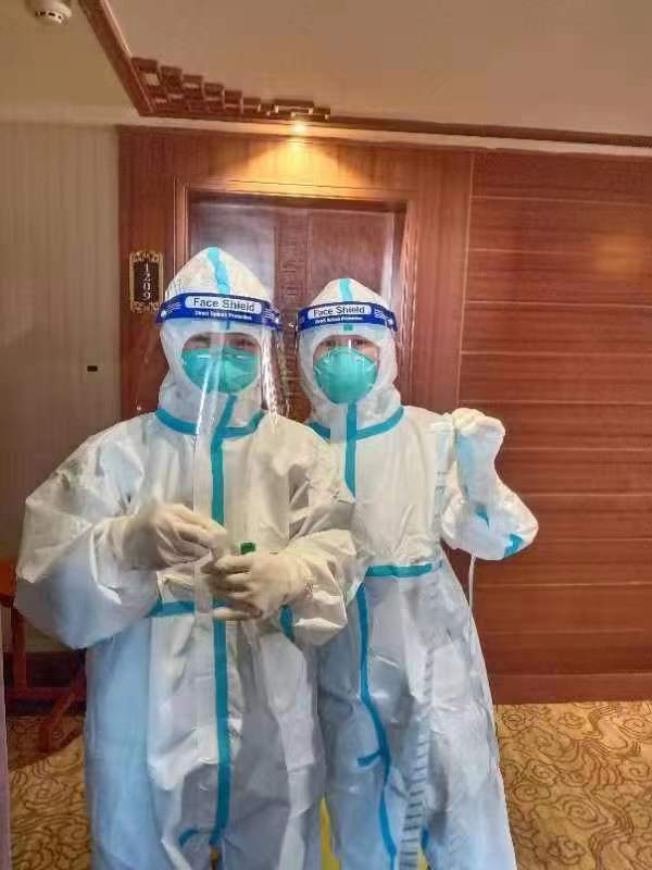 连续工作9小时的我们圆满完成了一天的工作,最后脱下防护服浑身湿透,去掉护目镜满脸勒痕,全面消杀后离开机场回到大巴车上等待大家集合离开。我们到达宾馆的时间是下午16点,即将进入隔离阶段,隔离期间我们采样组依然每天为隔离人员采集核酸!
