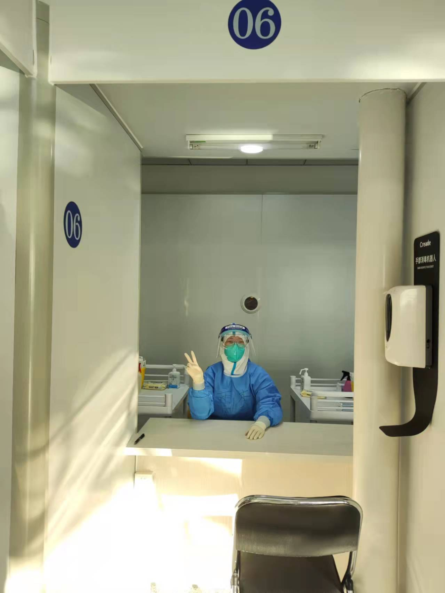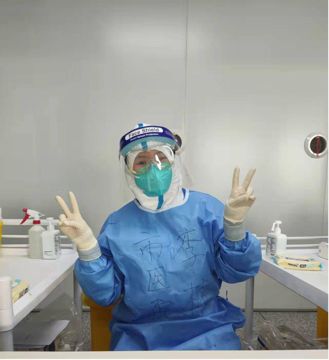 我们的工作是取拭子,伸进咽喉、鼻腔采样、装进试管、手消毒,“轻、快、稳”,右手这样一抬一落就完成了一例核酸采样,动作是那样娴熟严谨、有条不紊。在完成采集后又小心翼翼地消毒,生怕落下任何一个地方。就这样重复的操作,当我完成最后一个采集时,赶紧拿着条码单和核酸数量进行核对。数量对上了,心里才算放松,深深地松了一口气,瘫坐在椅子上进行短暂的休整。剩下的活就是打扫战场,消毒,消毒,再消毒!当我们离开这个采集点时,我的心又紧了起来,开始脱防护装备了,都知道穿的时候不用担心,脱才是最重要的,既要规范又不能暴露自己,真的是小心又小心。当我在脱卸区看到我们的刘菁松姐和于涛姐,心情顿时好了起来,他们反复的叮嘱我们,洗手,消毒,小心气溶胶!在他们反复叮嘱中我脱掉了一层层的防护装备。当我们走出清洁区的时候仿佛一切都结束了。身上一下就软了,赶紧找个地方坐下,大口喘着气,相互地和同事对视,我们脸上虽然都是印记,但是我们却大声地笑了起来,因为我们又打赢了一场胜仗……当我们回到大巴车上已是下午3点了。我们是先出来的,我们的防护指导却不能和我们一起回酒店,因为他们的工作还没有结束。就这样我们开始了14天的隔离。