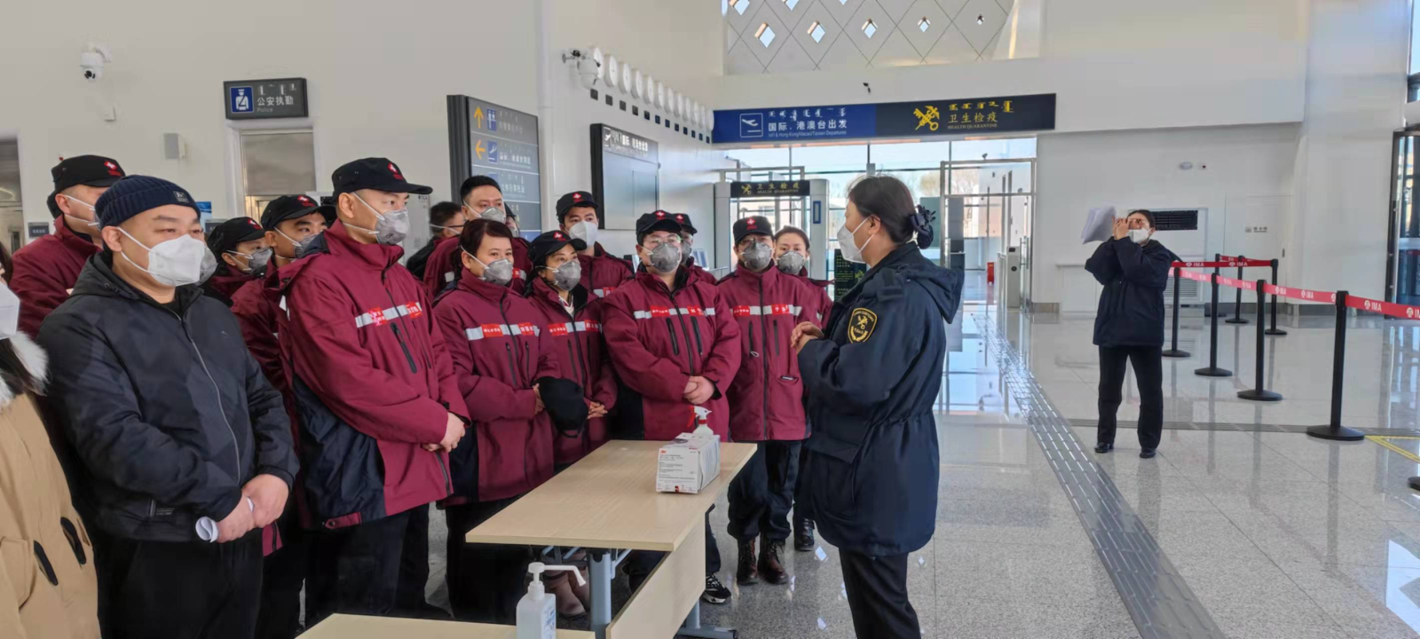 元月一日,在举国同庆的日子里,我们又一次准备迎接国际航班归国的同胞及友好来访的国际友人。因天气原因,飞机延误近10小时,队员们就早早准备好,下午4点,我们乘坐大巴车来到白塔机场新建的国际航站楼。虽然航站楼外零下十几度,但大家都精神抖擞地时刻准备着,等待着工作安排。海关关长向航站楼内各单位部门明确了当日任务内容,并强调了注意事宜后,要求各部门做好前期准备工作。