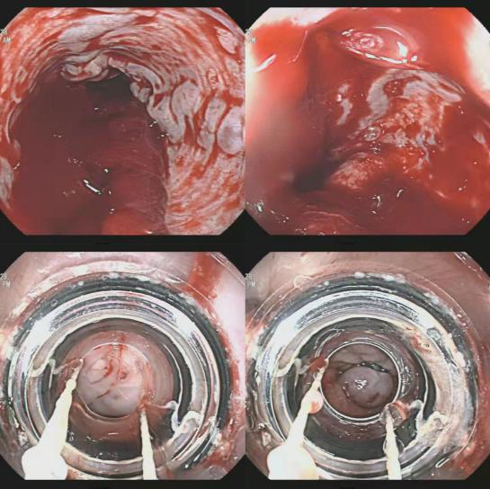 1月28日,一位老年女性患者无诱因出现大量呕血及黑便来我院西区治疗,既往诊断肝硬化肝功能失代偿期,入院时已出现血压下降、神志淡漠等失血性休克表现,病情危重。主管医生综合外科赵建明积极进行抢救、补液、输血,并第一时间联系了消化内镜中心西区胃镜室。西区胃镜室负责人李海鹏立即为患者行急诊胃镜检查,发现患者有重度食道静脉曲张并伴喷射状出血。李海鹏医生马上请示消化内镜中心马宏珍主任,并在马主任的指导及医生金雷,护士苗卓瑞、徐艳娇的配合下为患者成功实施内镜下食道静脉曲张套扎治疗,顺利止血,患者术后恢复良好,未再出现上消化道出血。