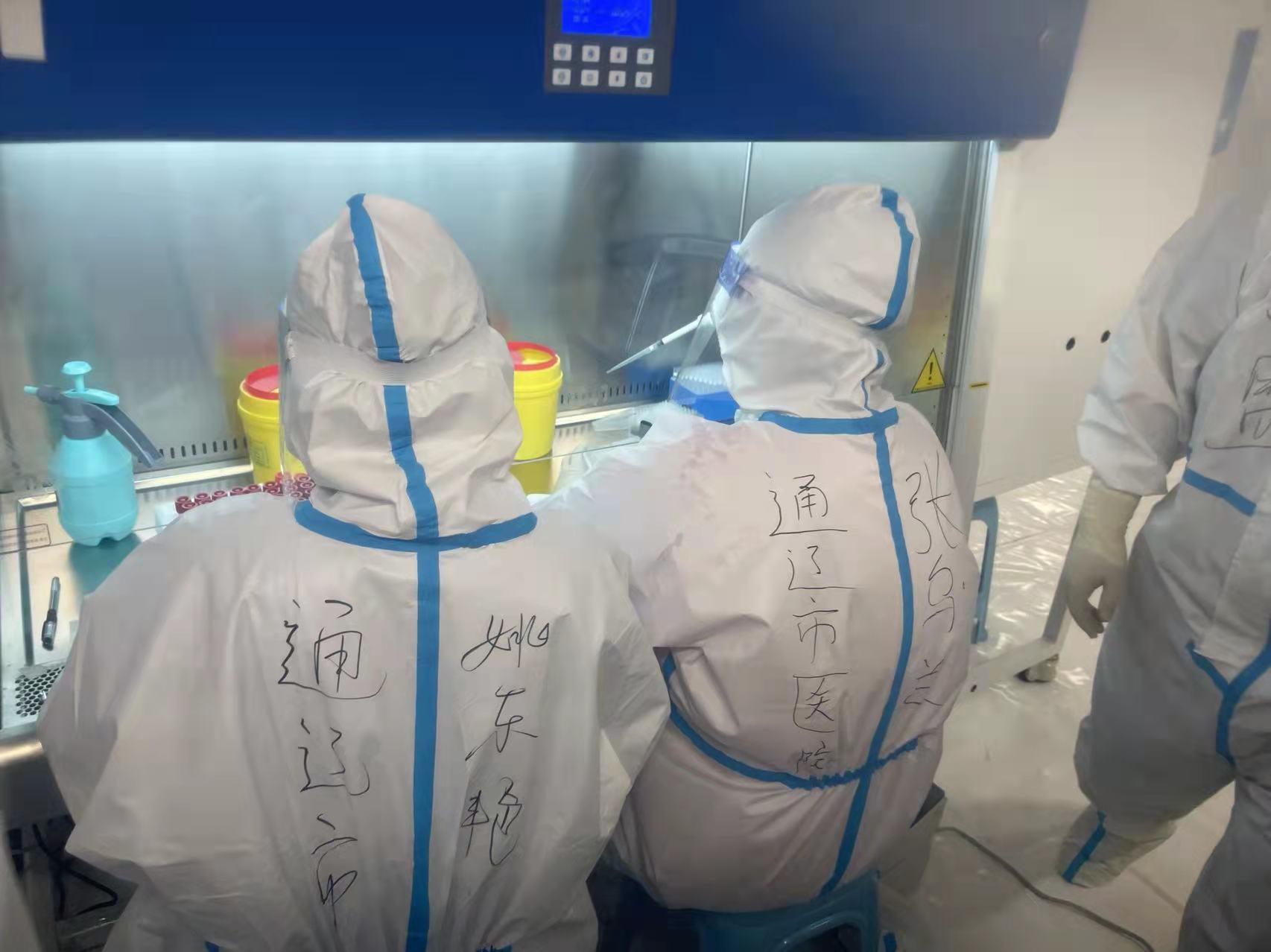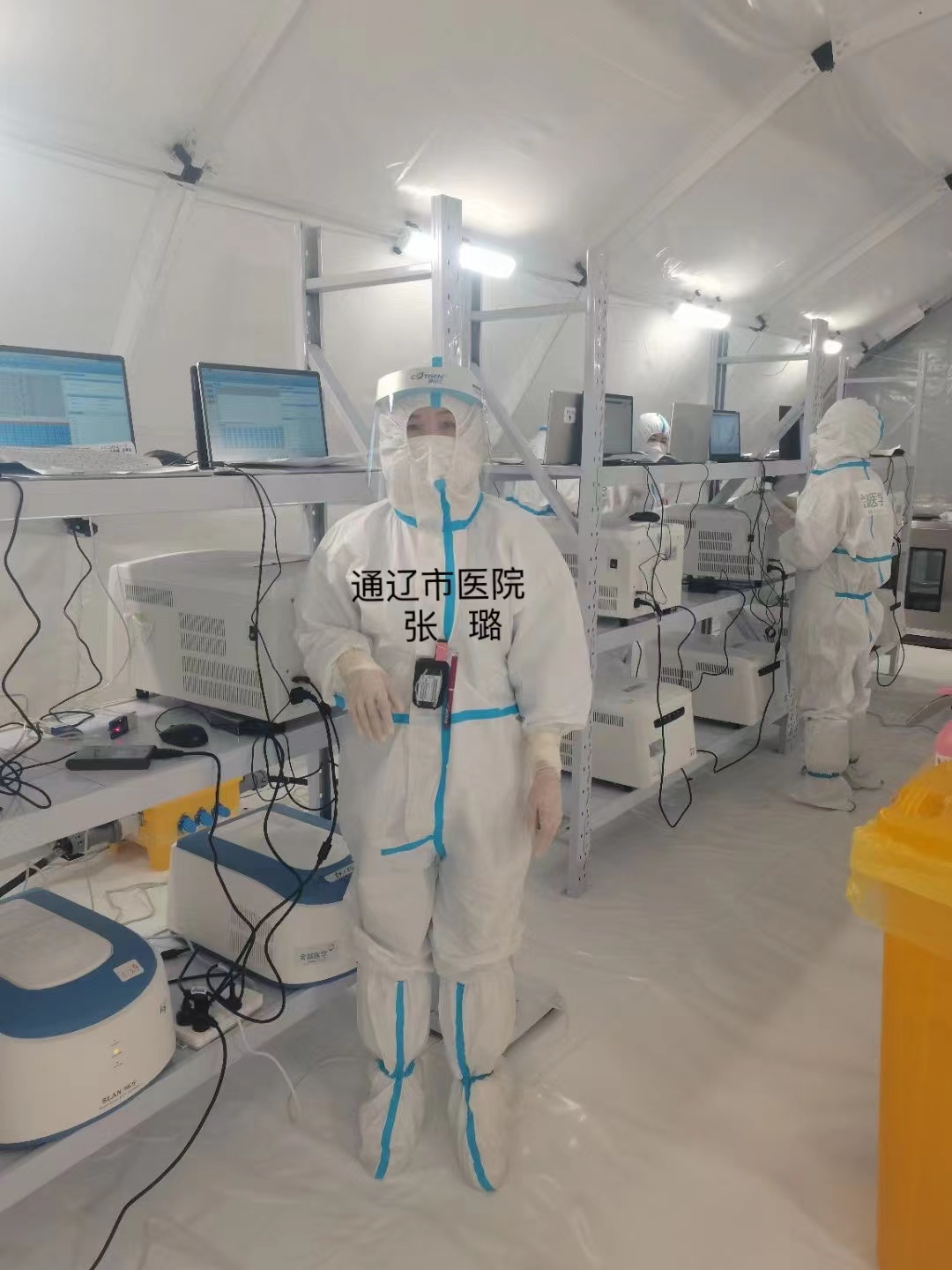 “我们通辽市医院医疗队与赤峰和锡盟共同负责气膜方舱一舱二区的工作,我担任二区组长。20号晚上接受第一批样本,从白天熟悉工作到晚上我留下来处理完最后一批加急样本,复查样本,等待结果和做好最后的消杀工作。回到宾馆已经是21号早上6点,连续近24小时的工作让我们感觉身体到达极限,但内心充满力量。大家在本着快速准确安全的原则下顺利完成任务,争分夺秒与病毒赛跑。”