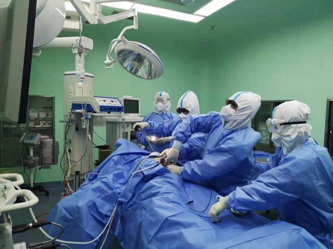 郭云峰医生与患者充分沟通病情后,向西区医务科负责人闵颖、综合外科刘德智主任、手麻科白永刚主任汇报情况,并在护理部主任刘巍的配合协作下确定了治疗及护理方案,决定即刻为患者行急诊腹腔镜阑尾切除术。手术相关人员按照新冠紧急入术室的路线及电梯前往开启负压隔离手术室,郭云峰和刘进医生标准防护后为患者进行手术。