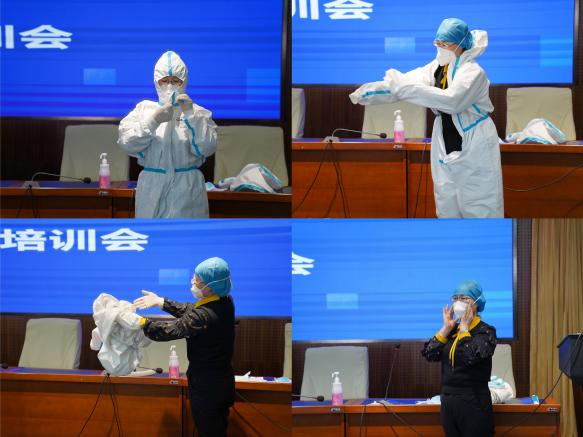 我院感染控制科负责人何淑花现场进行防护服穿脱的展示,从用物准备、洗手、防护服的穿脱等具体细节进行了现场示范和讲解,重点讲解了穿脱要点,强调防护细节及有关注意事项。
