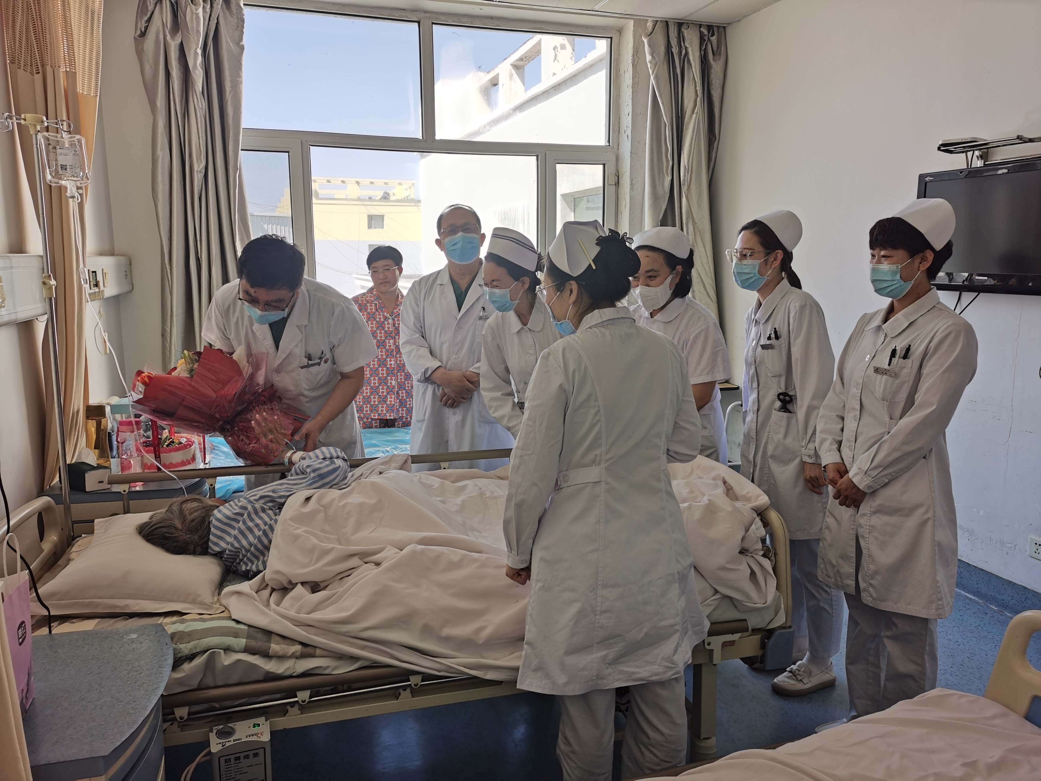 查房过程中,骨三科护士长刘海霞得知,4月7日正好是老人100岁的生日。为了让老人感受到家一般的温暖,当天一早,护士长就带领值班护士为老人的生日张罗起来,更换了新床单,整理物品。科室还为其买来了鲜花,病房里洋溢着温馨的气氛。老人的精神也好了许多,红光满面。上午10时30分,骨三科主任兰荫梧、护士长刘海霞带领全体值班医护人员来到百岁老人床前,送上祝福,共沾喜气。大家欢声唱起了生日祝福歌,并热烈鼓掌齐声祝贺老人百岁生日快乐,愿其早日康复,健康长寿!温馨的举动给予了患者和家属力量。看着鲜花、听着歌声,奶奶眼中闪烁着幸福的泪光,家属露出了真挚而感动的笑容:“感谢你们,太意外了,你们的关爱与照护让我们很感动,你们想得太周到了,太谢谢你们了!”