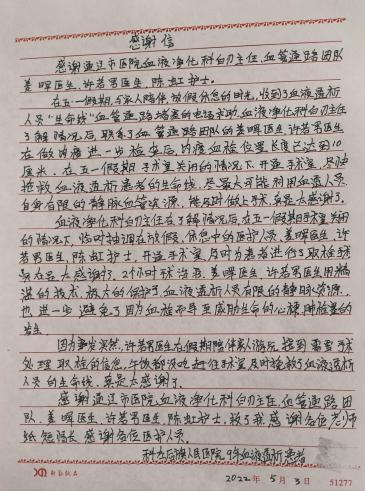 5月3日小长假期间,我院血液净化科收到了一封患者手写感谢信,信中表达了对科室医护人员的感激之情,赞扬了白衣天使们精湛的医术和以患者为中心的医风医德。
