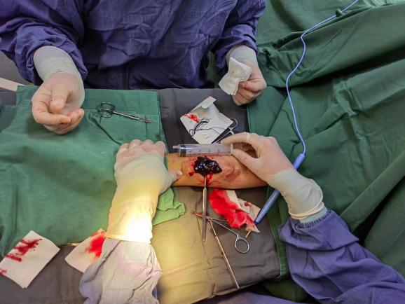 这位患者来自我市科左后旗,透析9年,因腹泻引起的低血压导致内瘘闭塞。内瘘为透析患者的“生命线”,如果不能得到及时处理,会影响透析患者生命。患者及时联系我院血液净化科白刃主任,休假中的姜晖、许若男医生闻讯立即赶往医院,对患者病情评估并对患者实行手术治疗。因患者内瘘血栓长约10cm,姜晖主治医师查看患者后决定行自体动静脉内瘘取栓术+自体动静脉内瘘重建术。术中取出血栓约40ml。手术成功,术后患者内瘘震颤杂音良好,正常透析。患者对我院的及时救治十分满意,并送上亲笔感谢信表达谢意。